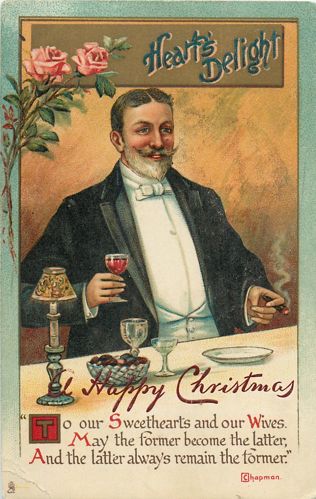 verse:- "TO OUR SWEETHEARTS AND OUR WIVES. MAY THE FORMER BECOME THE LATTER, AND THE LATTER ALWAYS REMAIN THE FORMER.", comes opt. in red A HAPPY CHRISTMAS