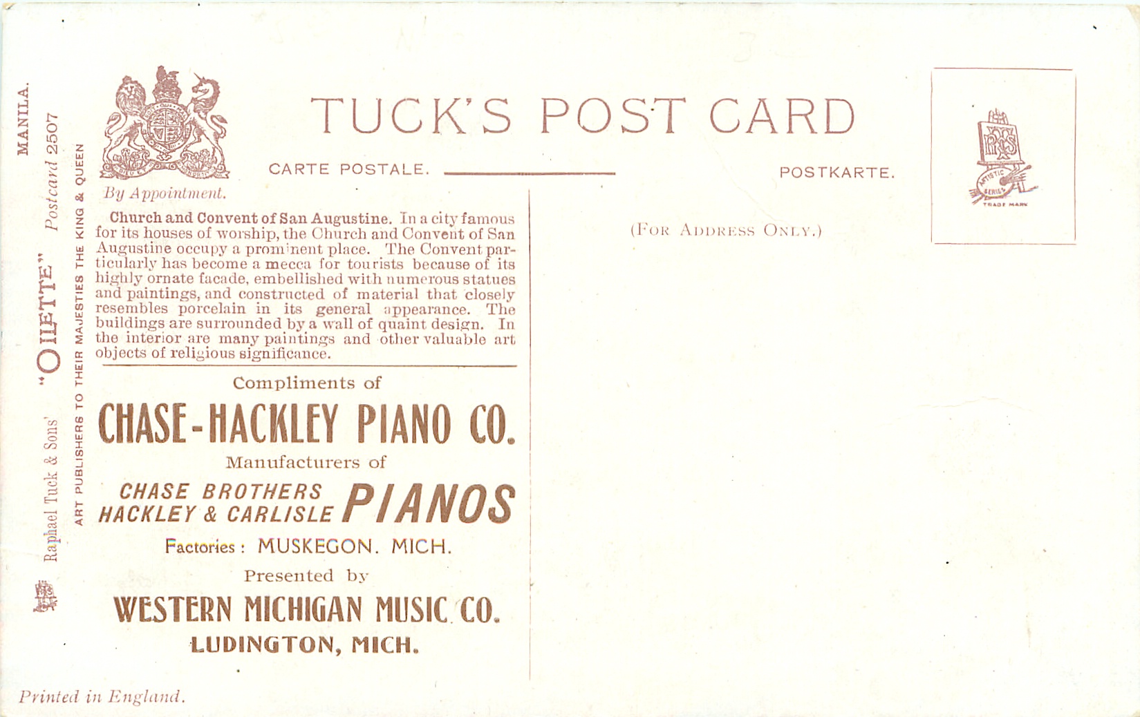 comes with COMPLIMENTS OF ESTEY PIANO CO. NEW YORK CITY 65 YEAR OFHONOR IN MUSICAL INSTRUMENT MAKING, U-KNO CHOCOLATES ARE INDIANAPOLIS CANDY CO/, CHASE-HACKLEY PINO CO.//LUDINGTON, MICH.