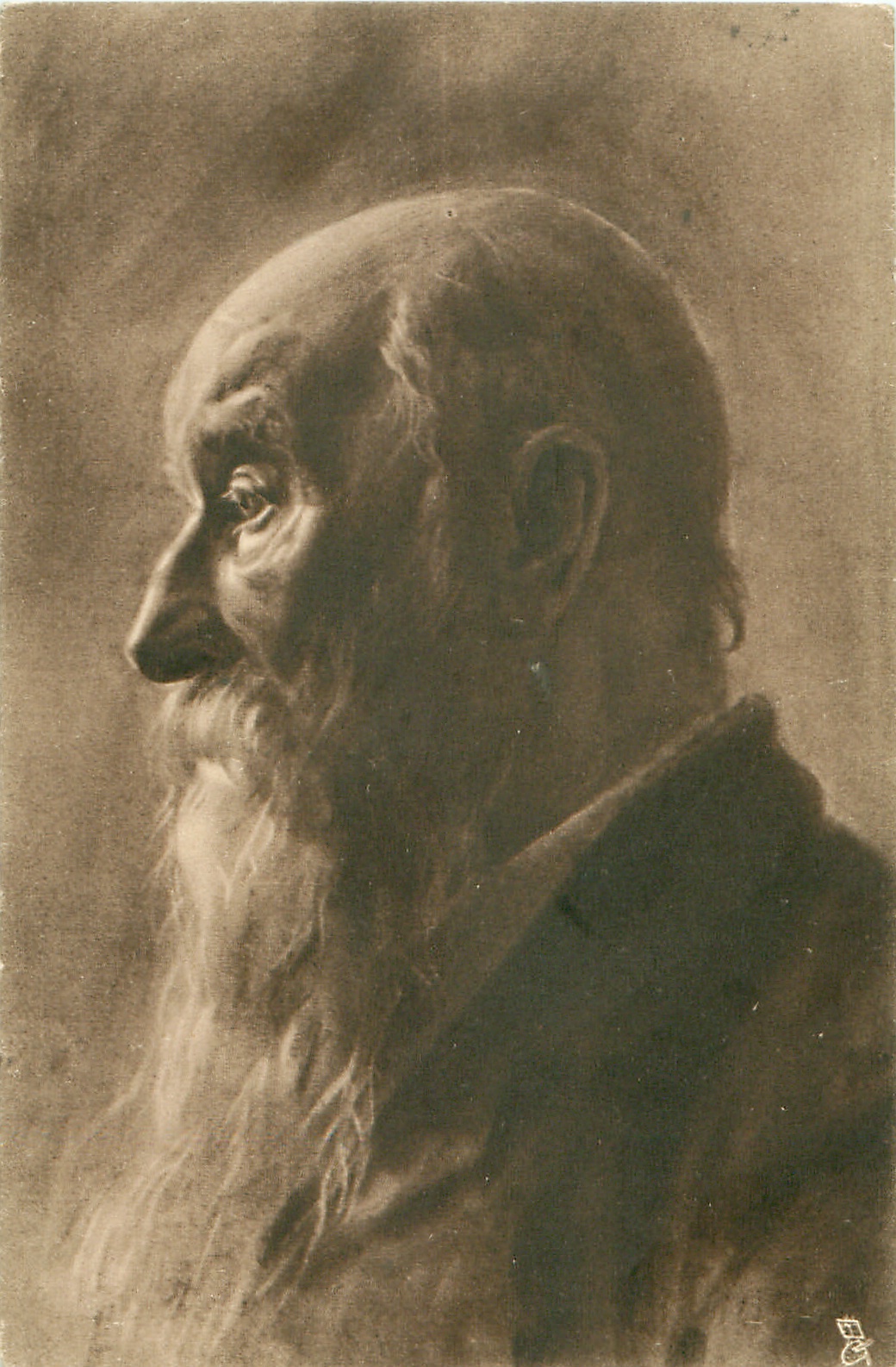 head & shoulders of man facing & looking left, partially bald, long white beard