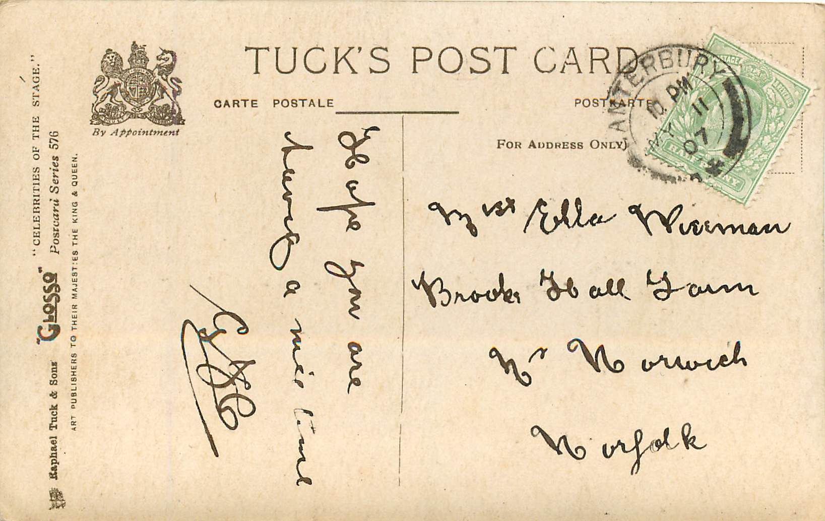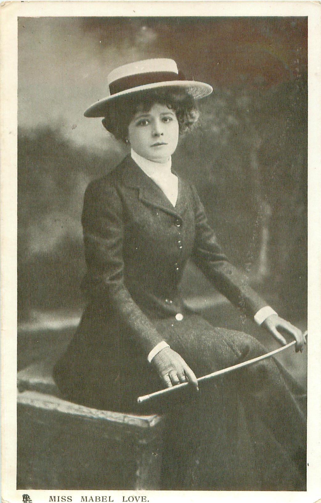 both hands on riding crop as if to bend it, straw hat, gloves Mable Love (1874-1953) Dancer was The Rose in "Alice of Wonderland" Prince of Wales Th. London 1909;