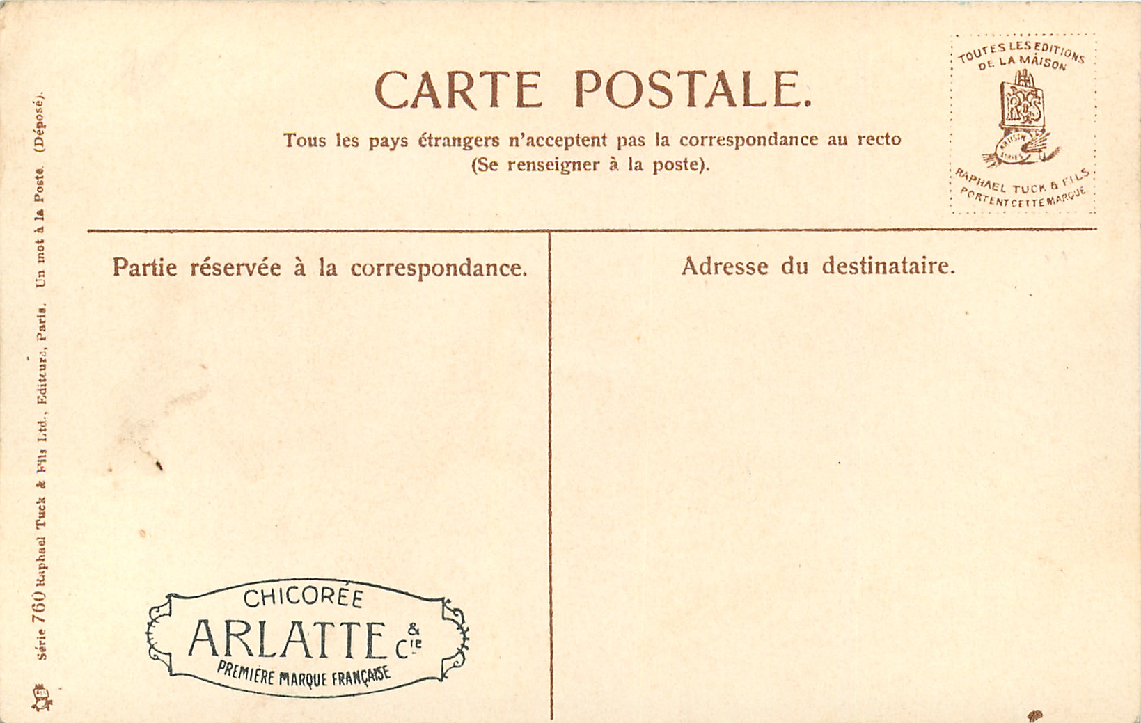 same images, English backs 6876, German backs 354B, UN MOT A LA POSTE (DEPOSE), come with CHICOREE ARLATTE & CIE ad on back