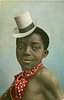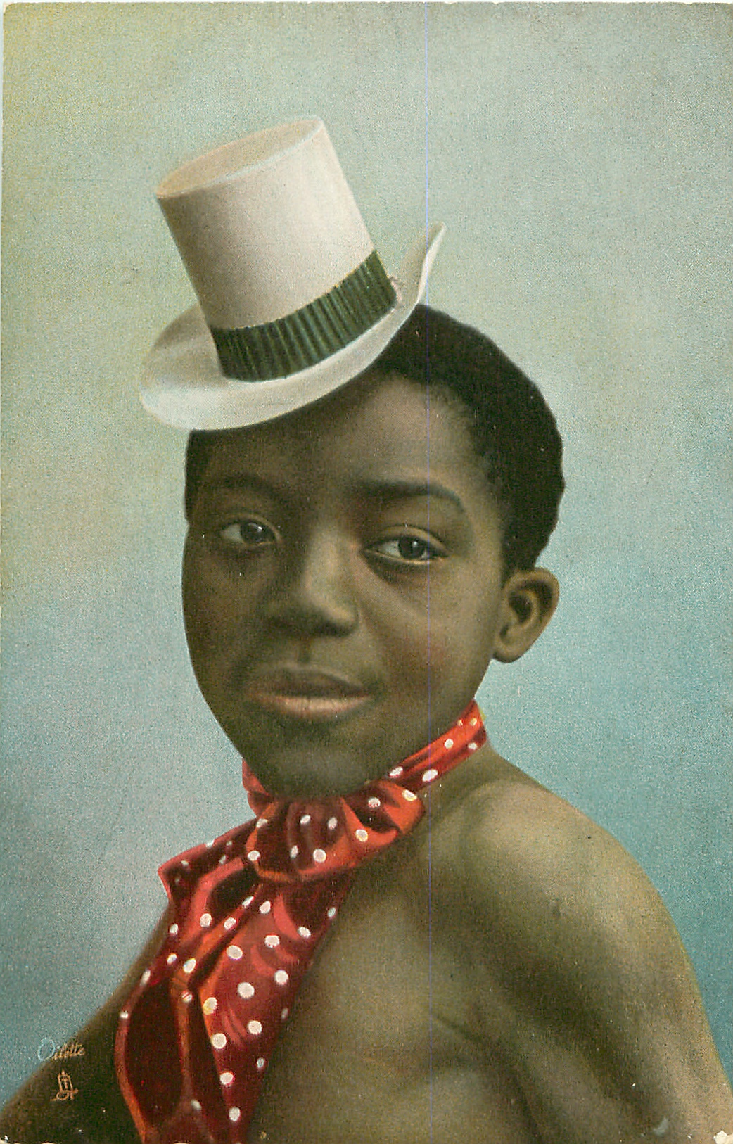 young black man with white hat with green striped band, facing left looking front