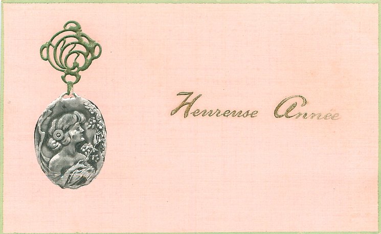 HEUREUSE ANN nouveau style silver medallion, showing woman looking right, hangs from ornate support, card has green margins, light pink background