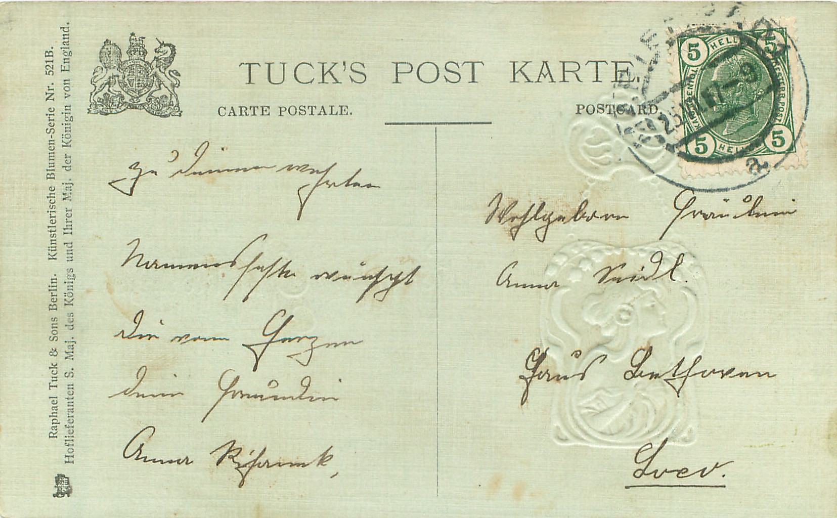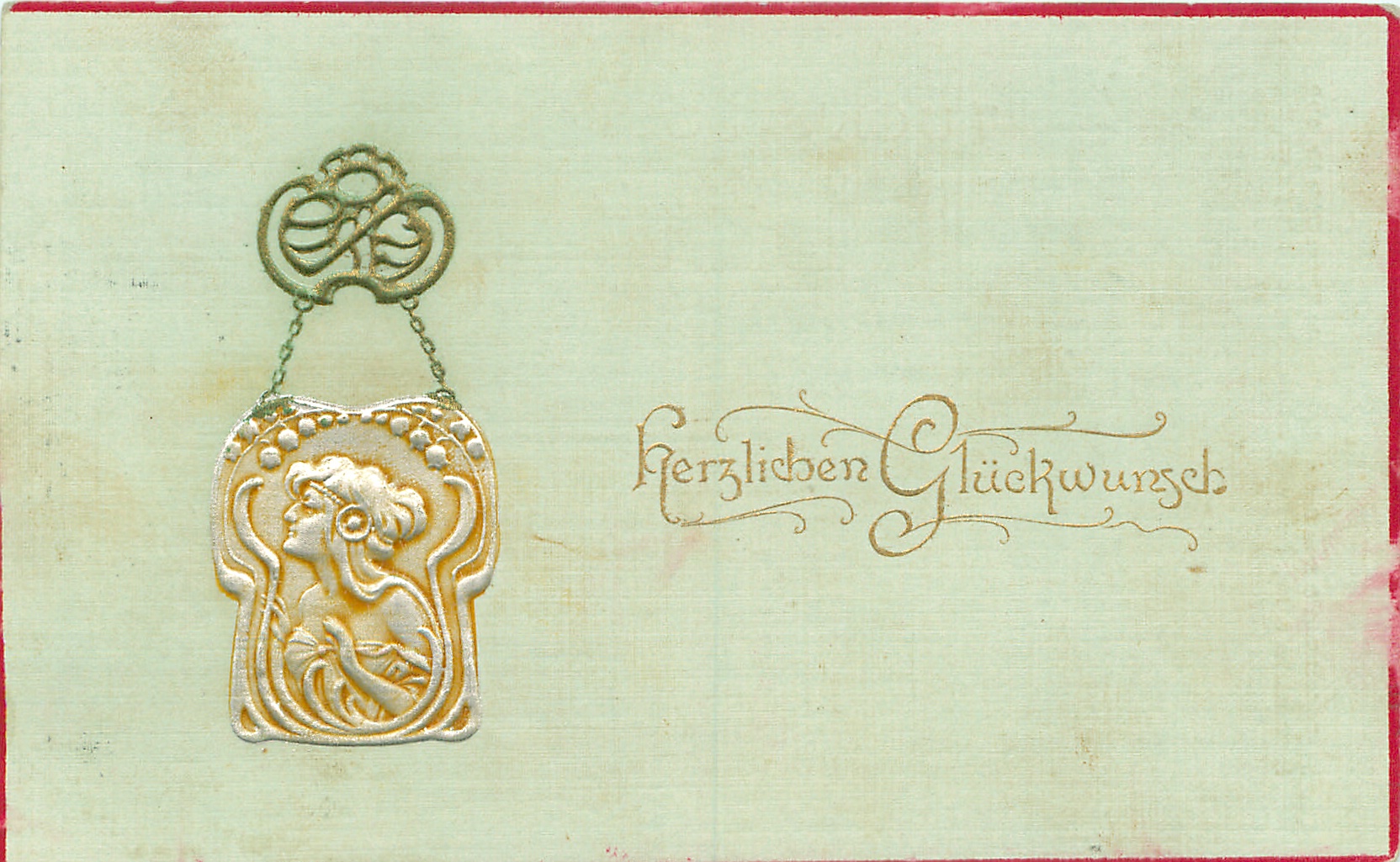 HERZLICHEN GLUCKWUNSCH nouveau style silver medallion, showing woman looking left, hangs from ornate support, card has red margins, light green background