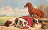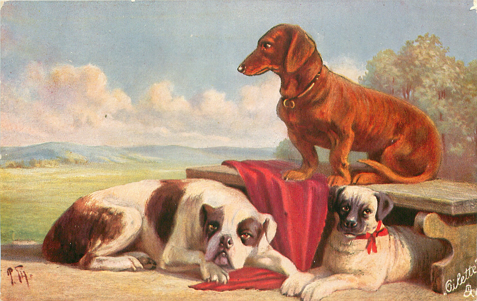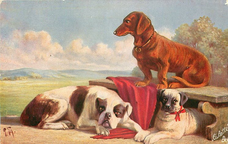 DREI GUTE FREUNDE three dogs, brown dachshund on seat, cream coloured dog with black face to right, bulldog left
