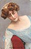 head & shoulders, lacey light blue dress, pearls in hat, red sofa arm under, right arm, looking down