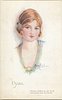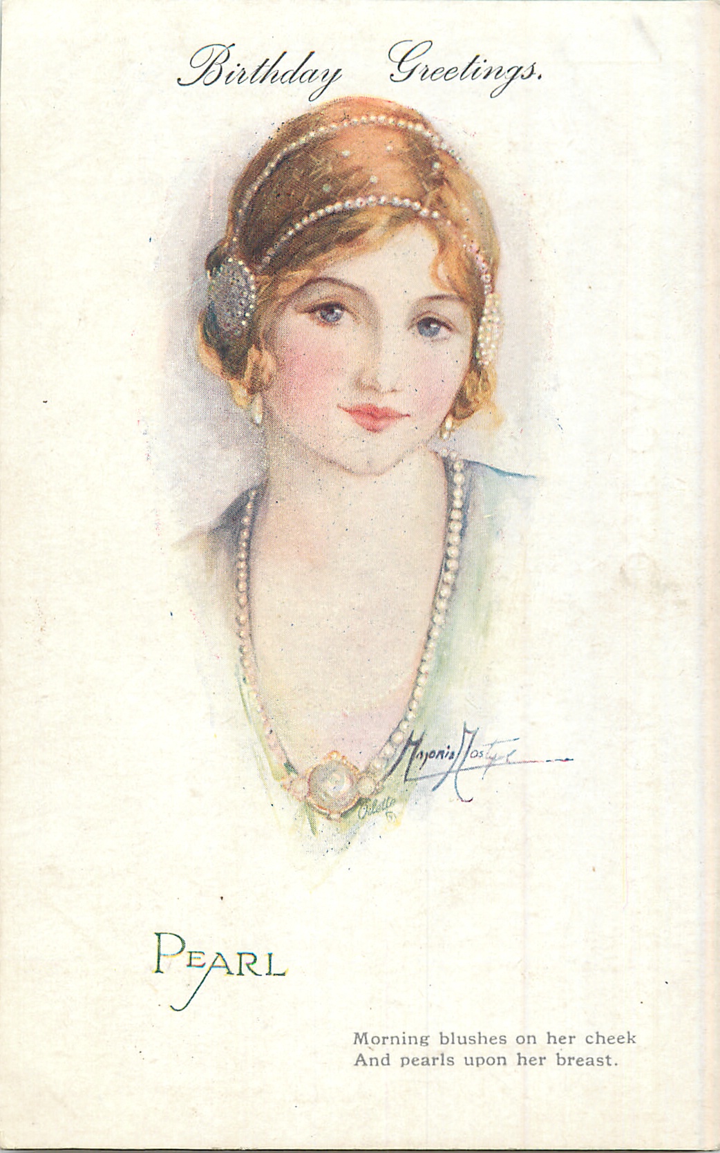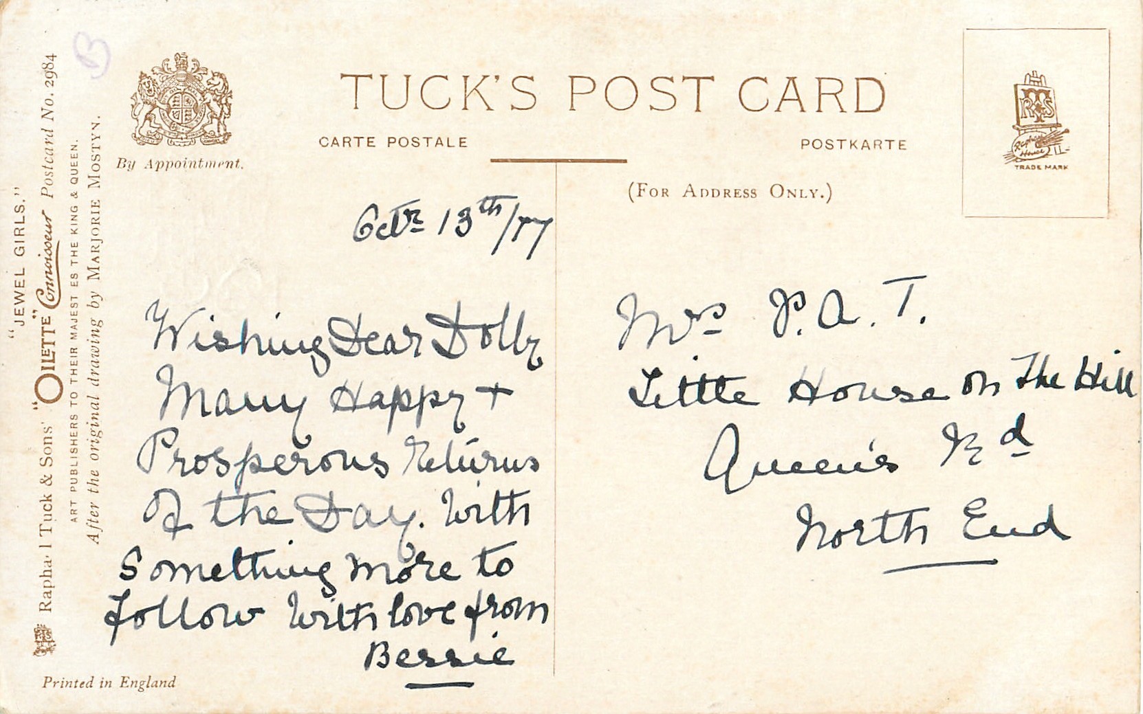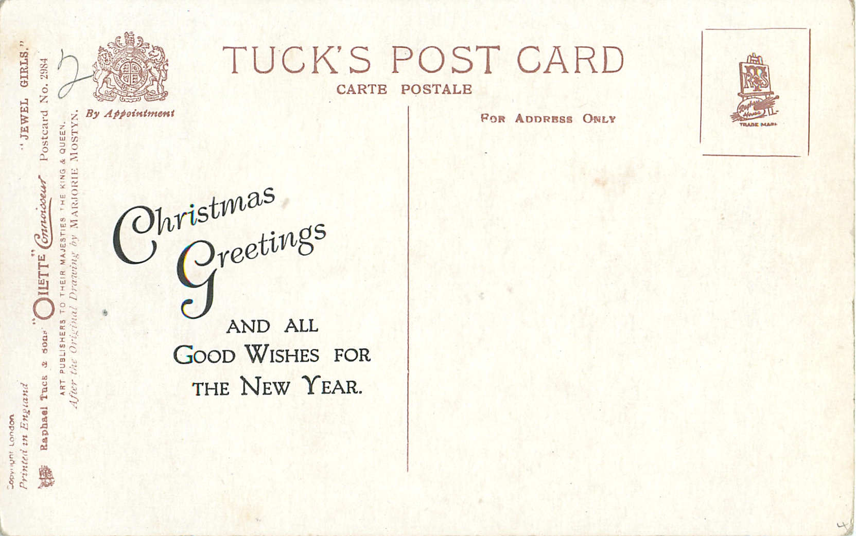 OILETTE CONNOISSEUR, PRINTED IN ENGLAND, with & w/o COPYRIGHT LONDON, quote on bottom of each card, come with greetings printed on back, AFTER THE ORIGINAL DRAWING BY MARJORIE MOSTYN.. listed in1930 POSTCARD Catalogue