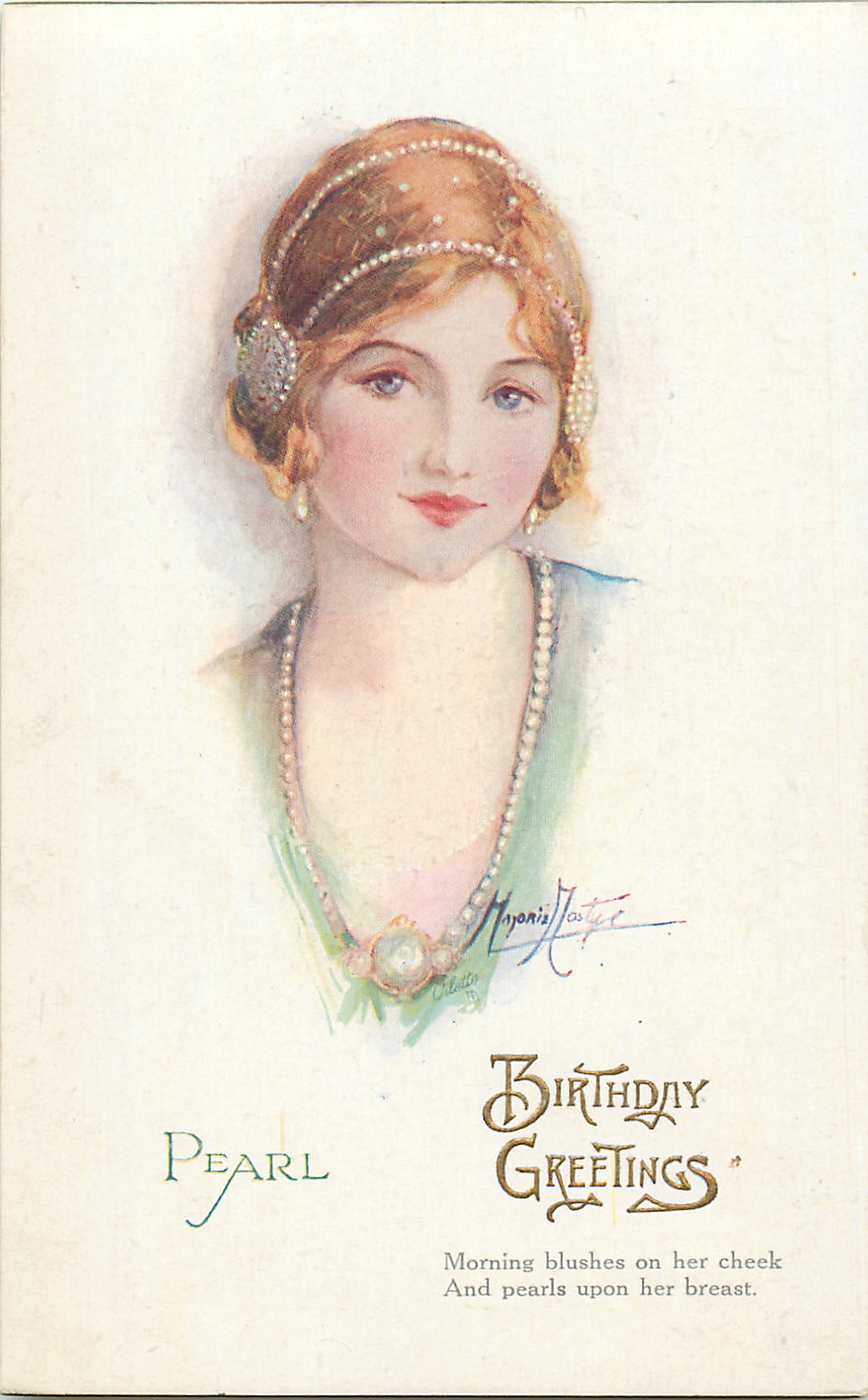 verse:- MORNING BLUSHES ON HER CHEEK AND PEARLS UPON HER BREAST., come opt. in gilt or black BIRTHDAY GREETINGS
