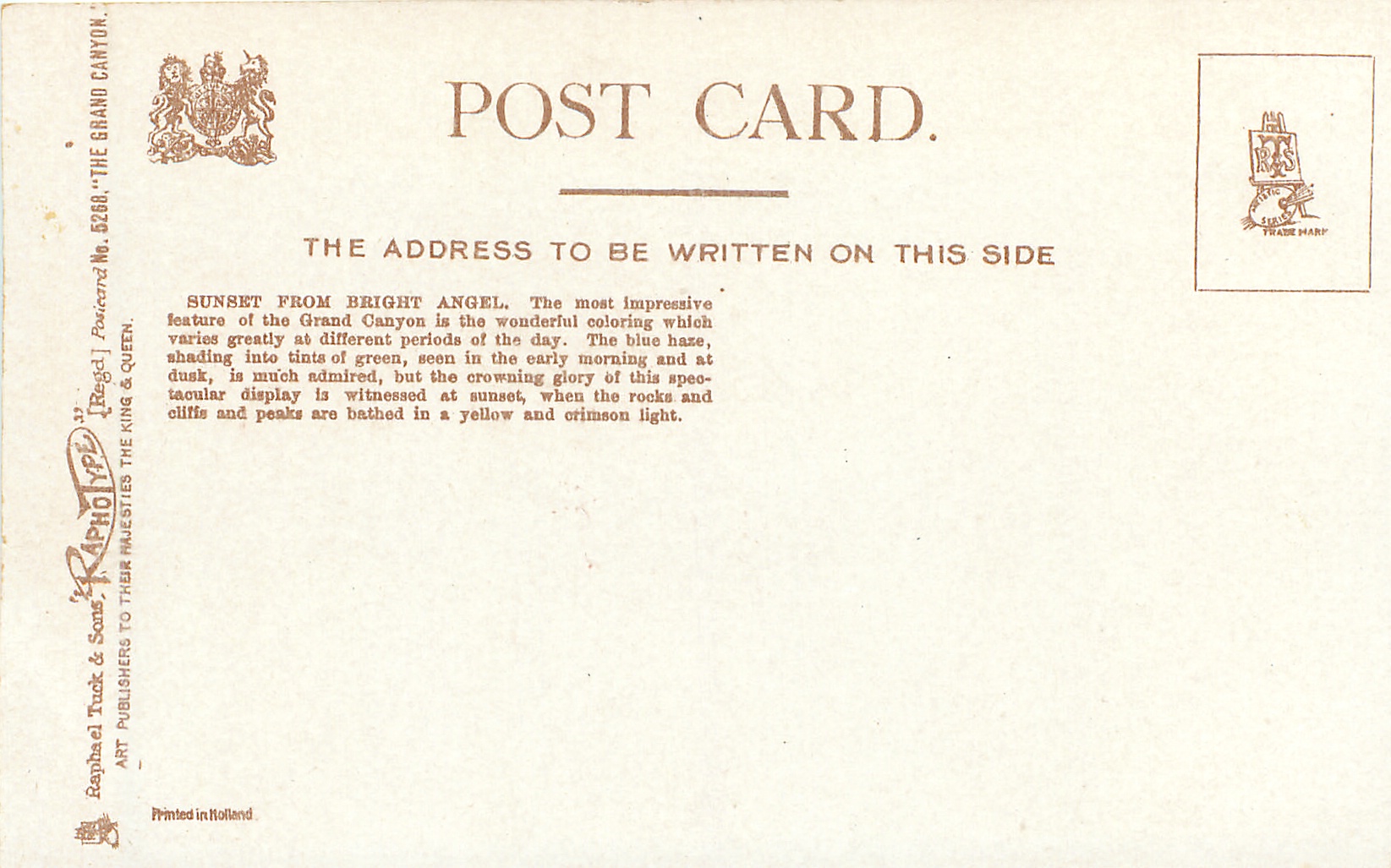 u/b, RAPHOTYPE, PRINTED IN HOLLAND (2 styles), same image, title & description COLLOTYPE (i.n. 6264-6275) & SILVERETTE (i.n. 7264-7275)