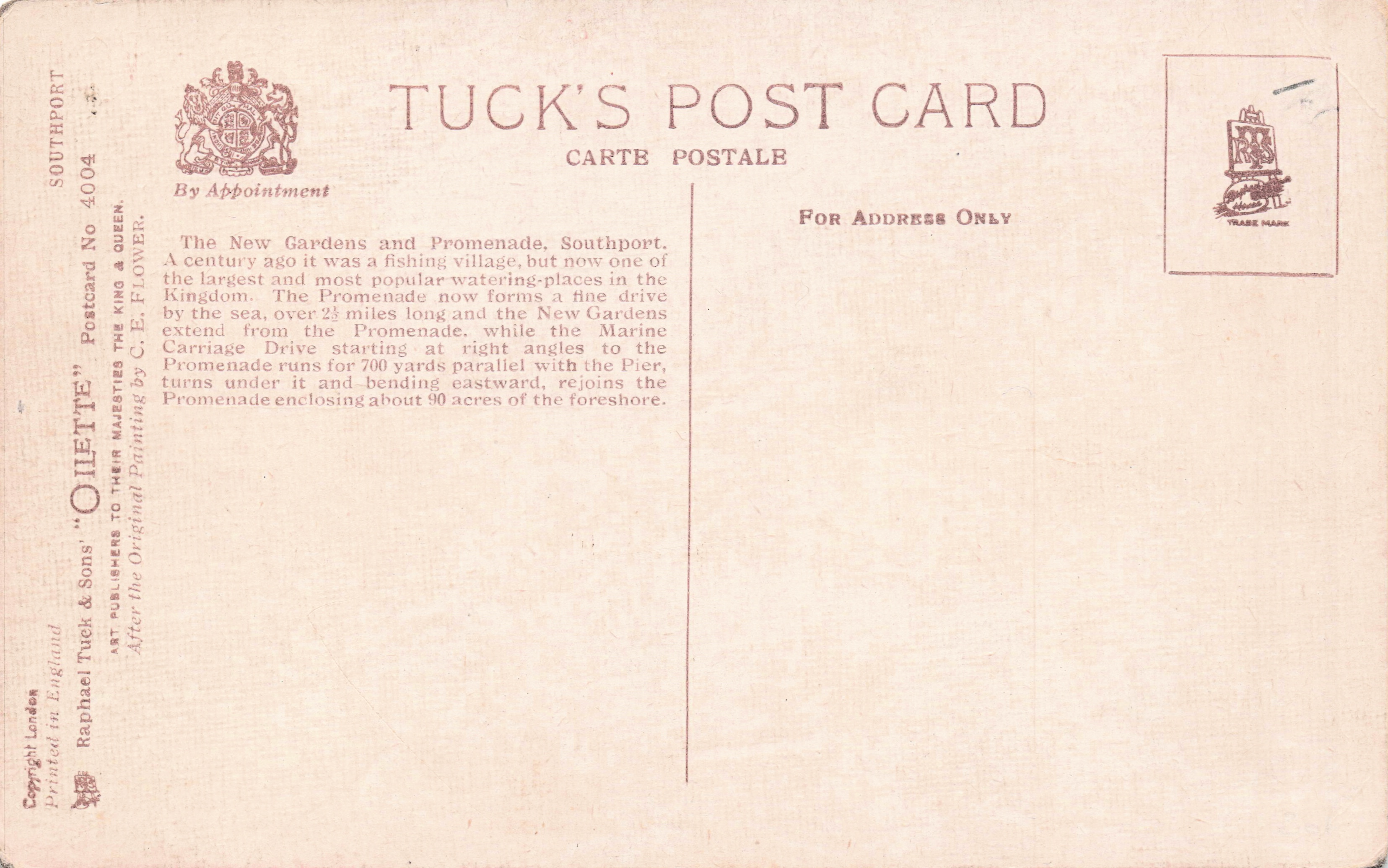 COPYRIGHT LONDON, PRINTED IN ENGLAND, OILETTE, comes oilfacsim but not so trade-named, listed in 1930 POSTCARD Catalogue
