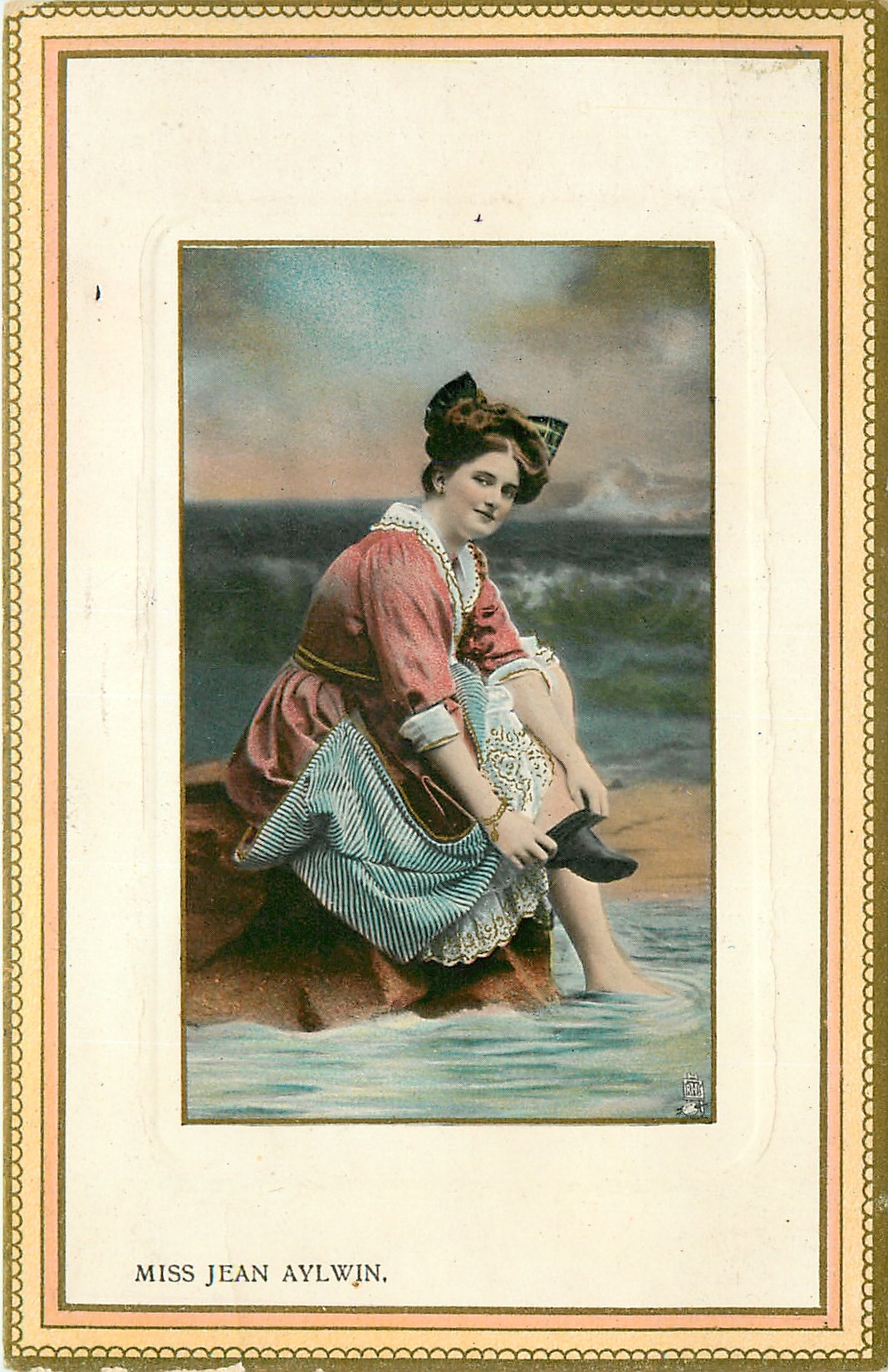 MISS JEAN AYLWIN seated on rock , one foot in sea, putting on a stocking