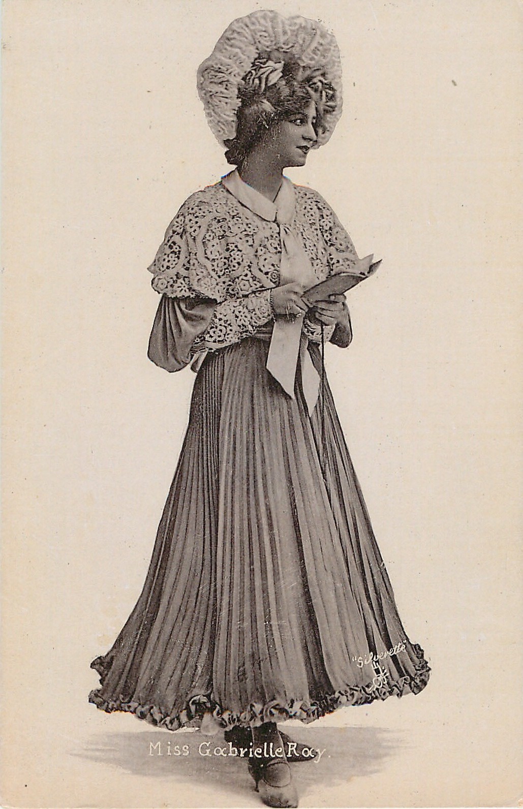 MISS GABRIELLE RAY full length, white lacy top & hat, pleated skirt, facing right, white background
