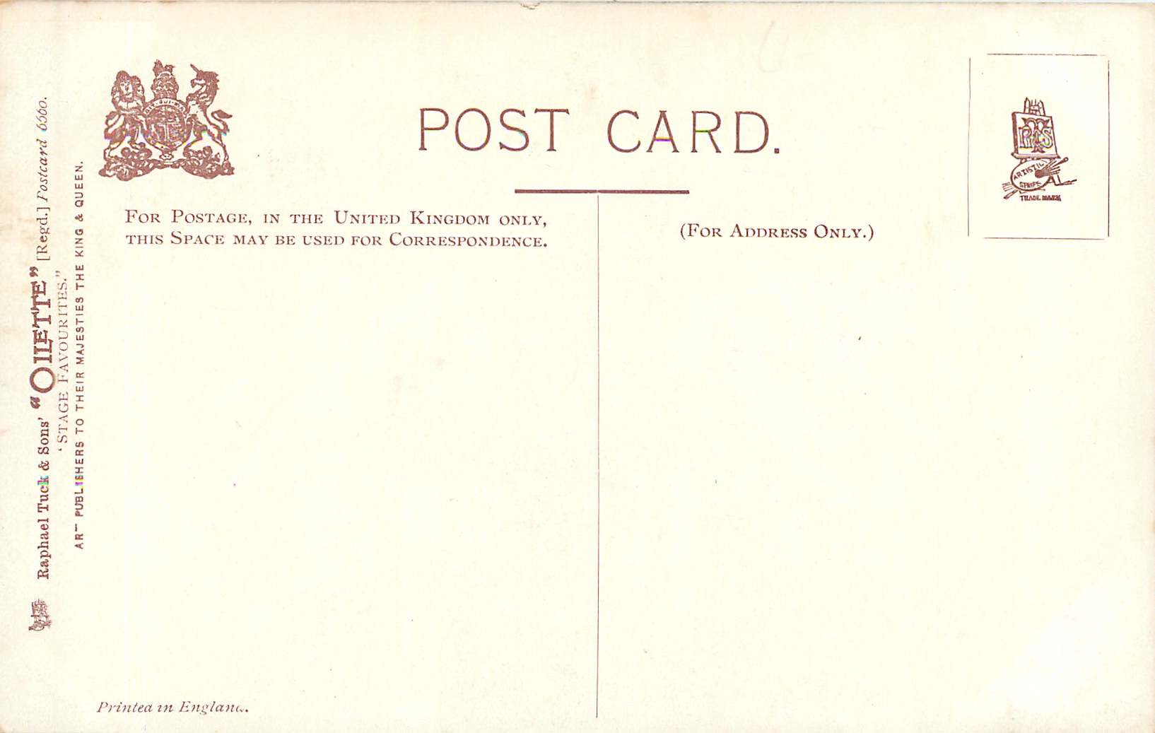 OILETTE, PRINTED IN ENGLAND, 2 backs, listed in 1908/1909 & 1911/1912 & 1913/1914 Postcard Catalogues