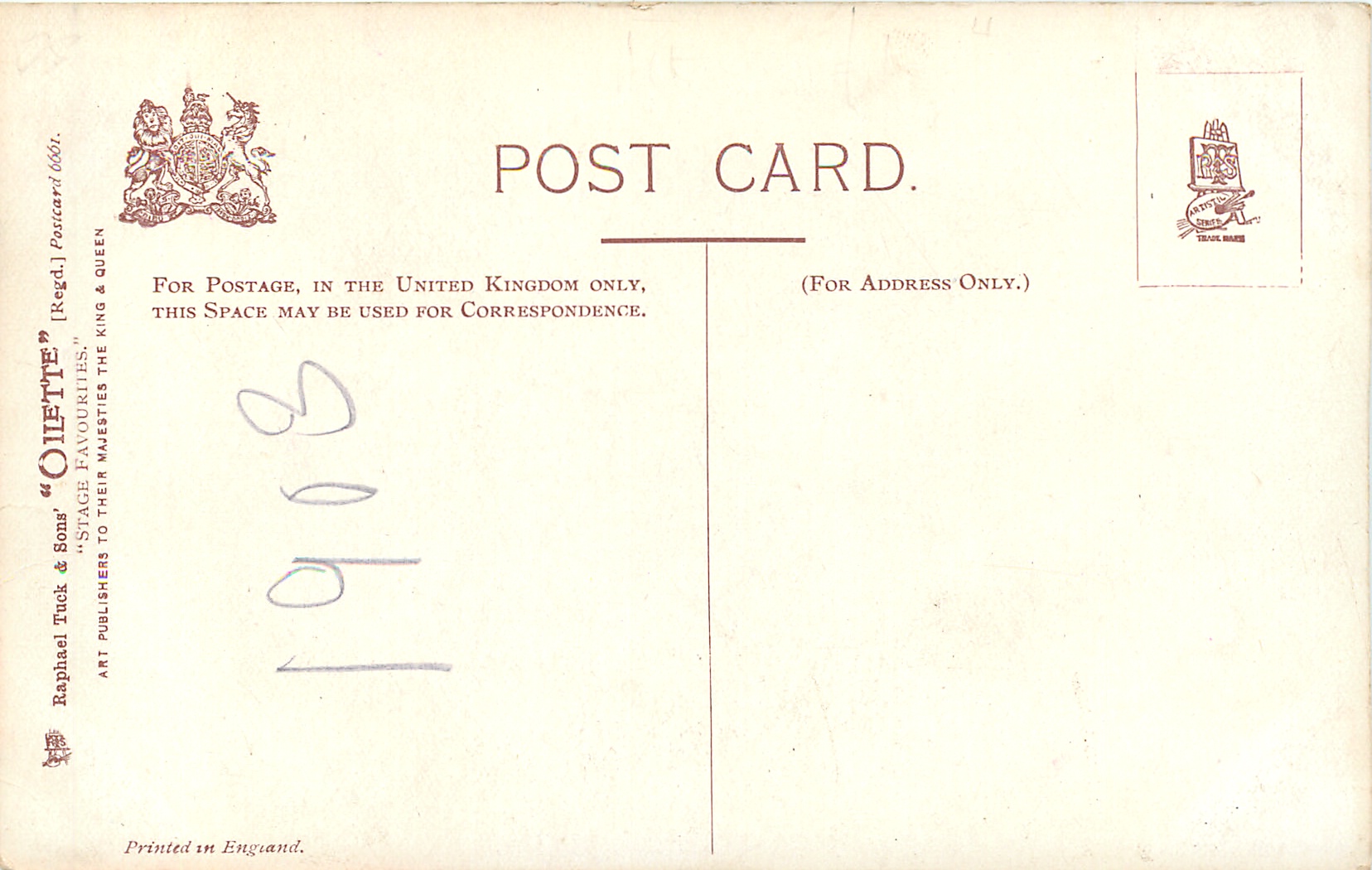 OILETTE, PRINTED IN ENGLAND, 2 backs, listed in 1911/1912 & 1913/1914 Postcard Catalogues