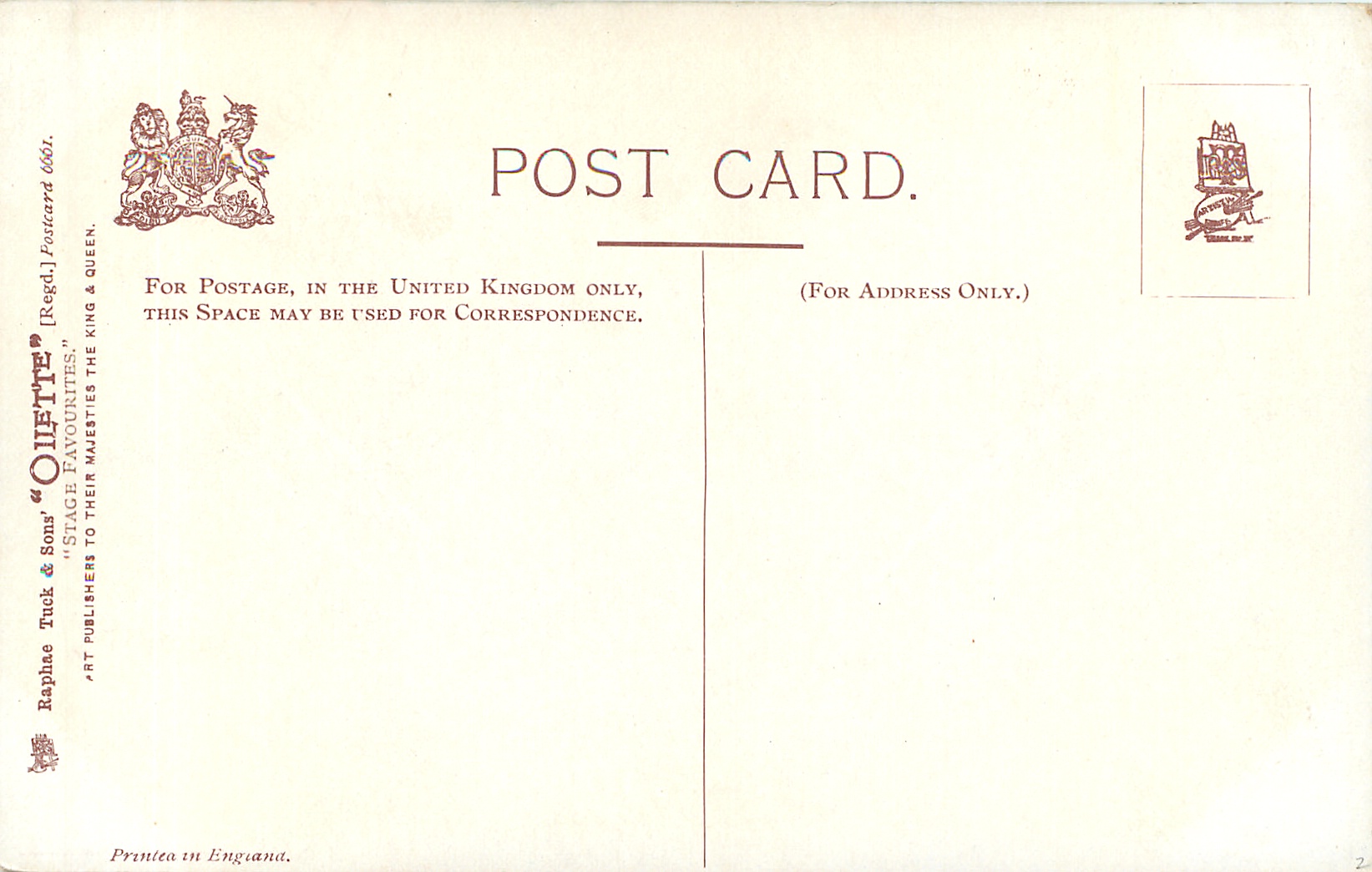 OILETTE, PRINTED IN ENGLAND, 2 backs, listed in 1911/1912 & 1913/1914 Postcard Catalogues