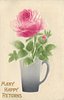 MANY HAPPY RETURNS pink rose & bud, green stem & leaves in grey mug