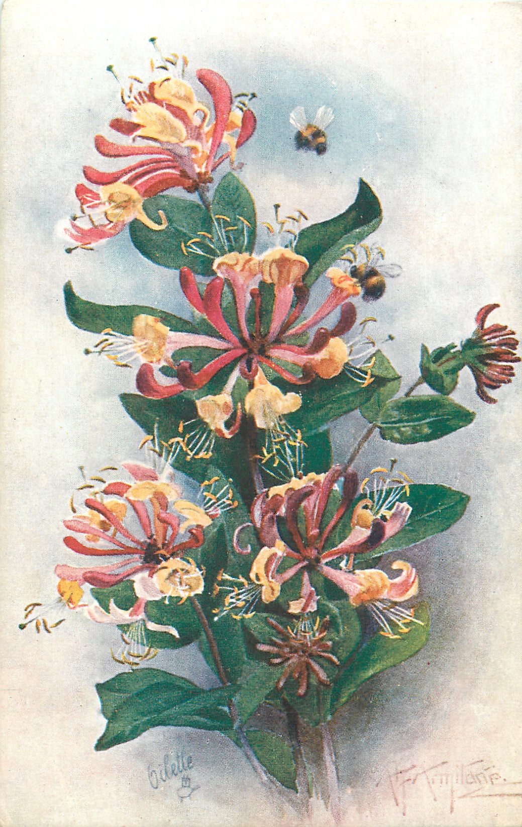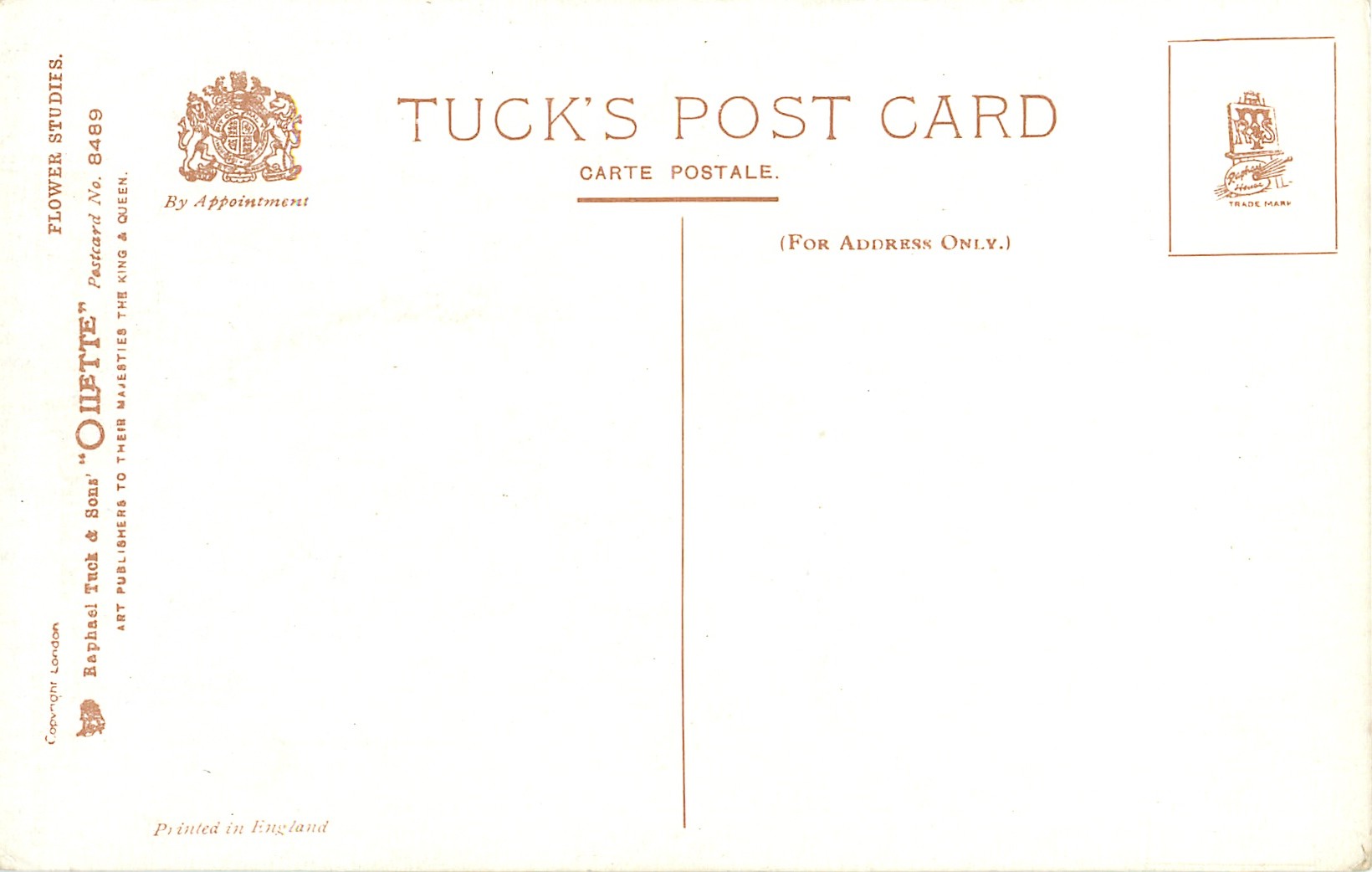 OILETTE, COPYRIGHT LONDON, PRINTED IN ENGLAND or PRINTED IN THE UNITED KINGDOM, 2 backs, come with various greetings & verses, listed in 1926/1927 POSTCARD Catalogue