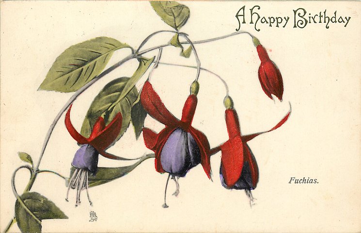 comes opt. in green/black A HAPPY BIRTHDAY, comes with gilt card edges the flowers are spelled fuchsias