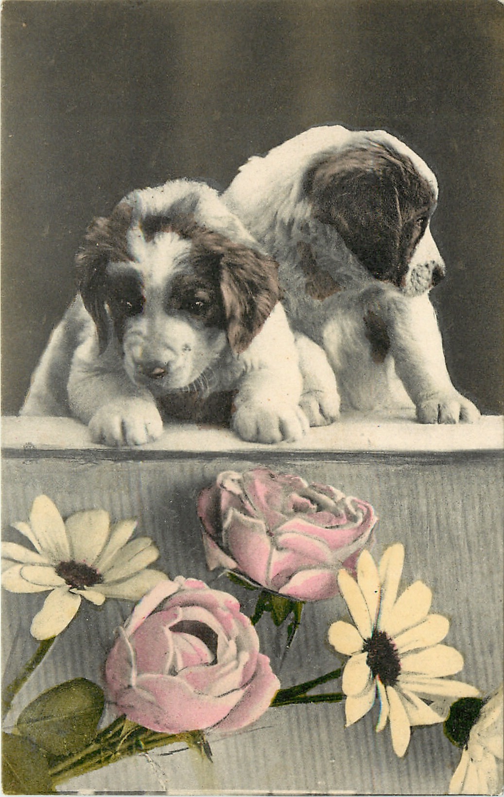 two puppies lean on ledge, two roses and two daisy like flowers below