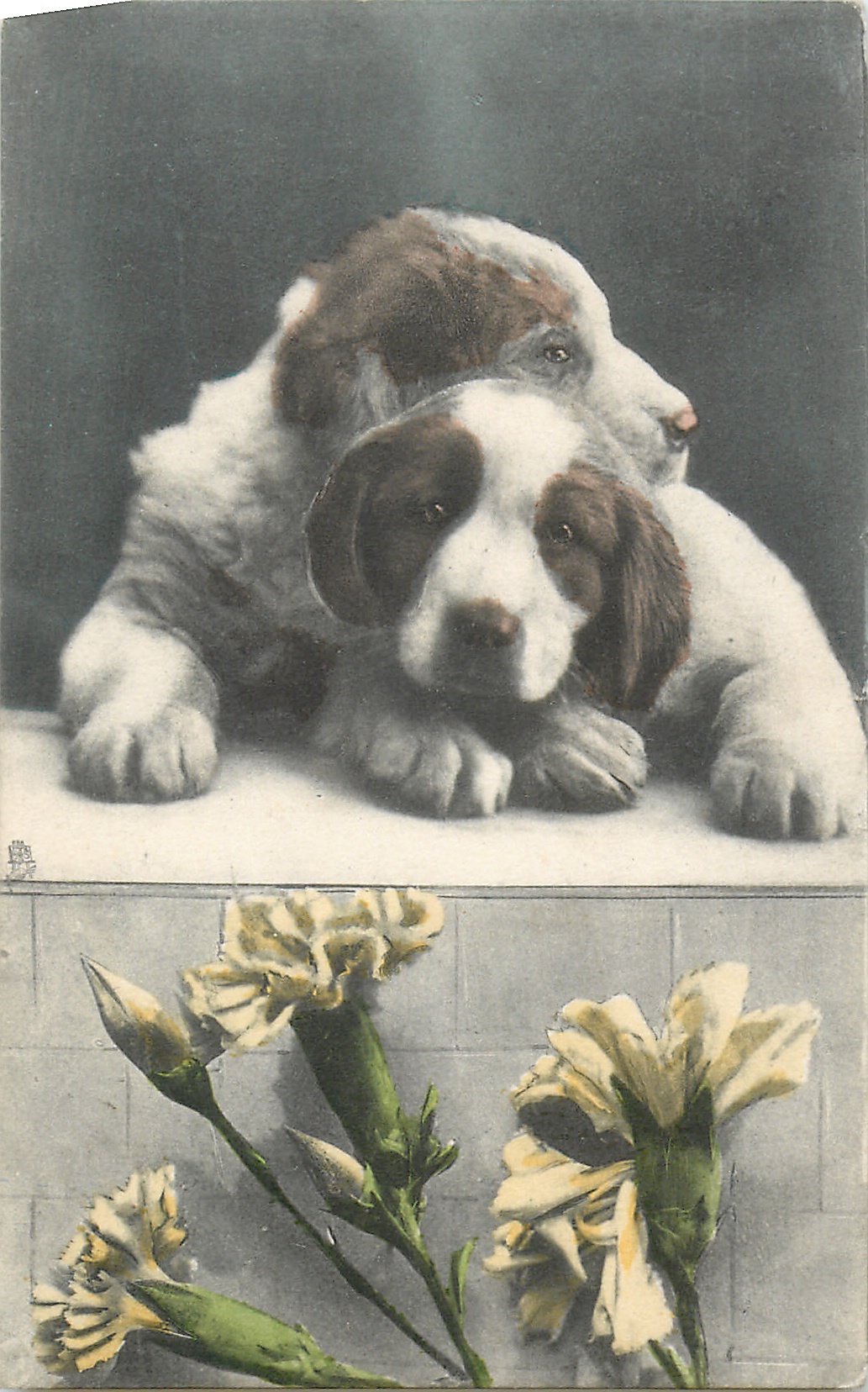 two St. Bernard puppies cuddle on wall, carnations below