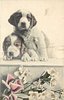 two St. Bernard puppies cuddle on wall, two cultivated roses with a spray of wild roses below