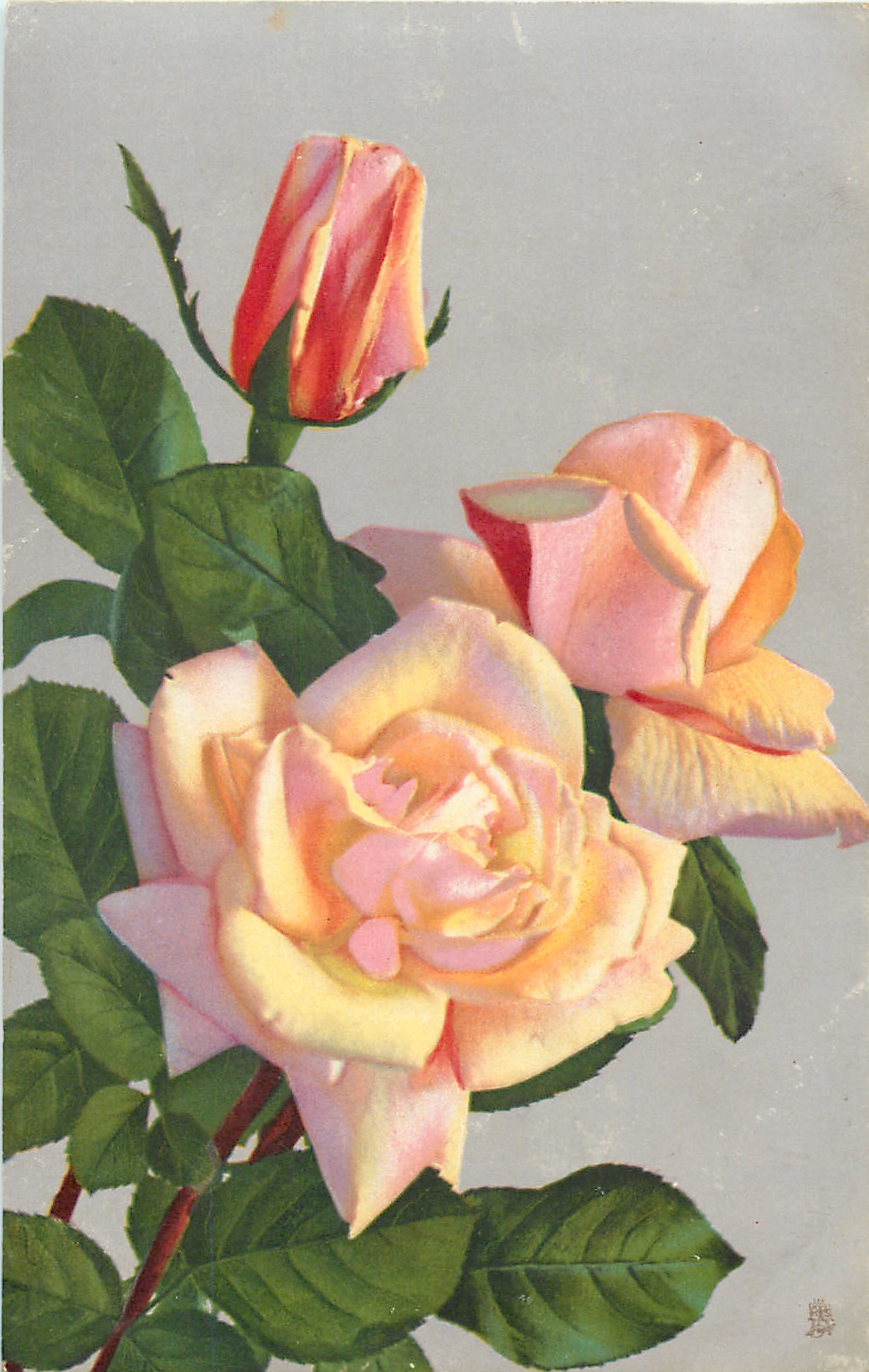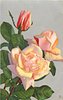 two open yellow/pink roses and one almost open above and left, two or three stems to lower left corner