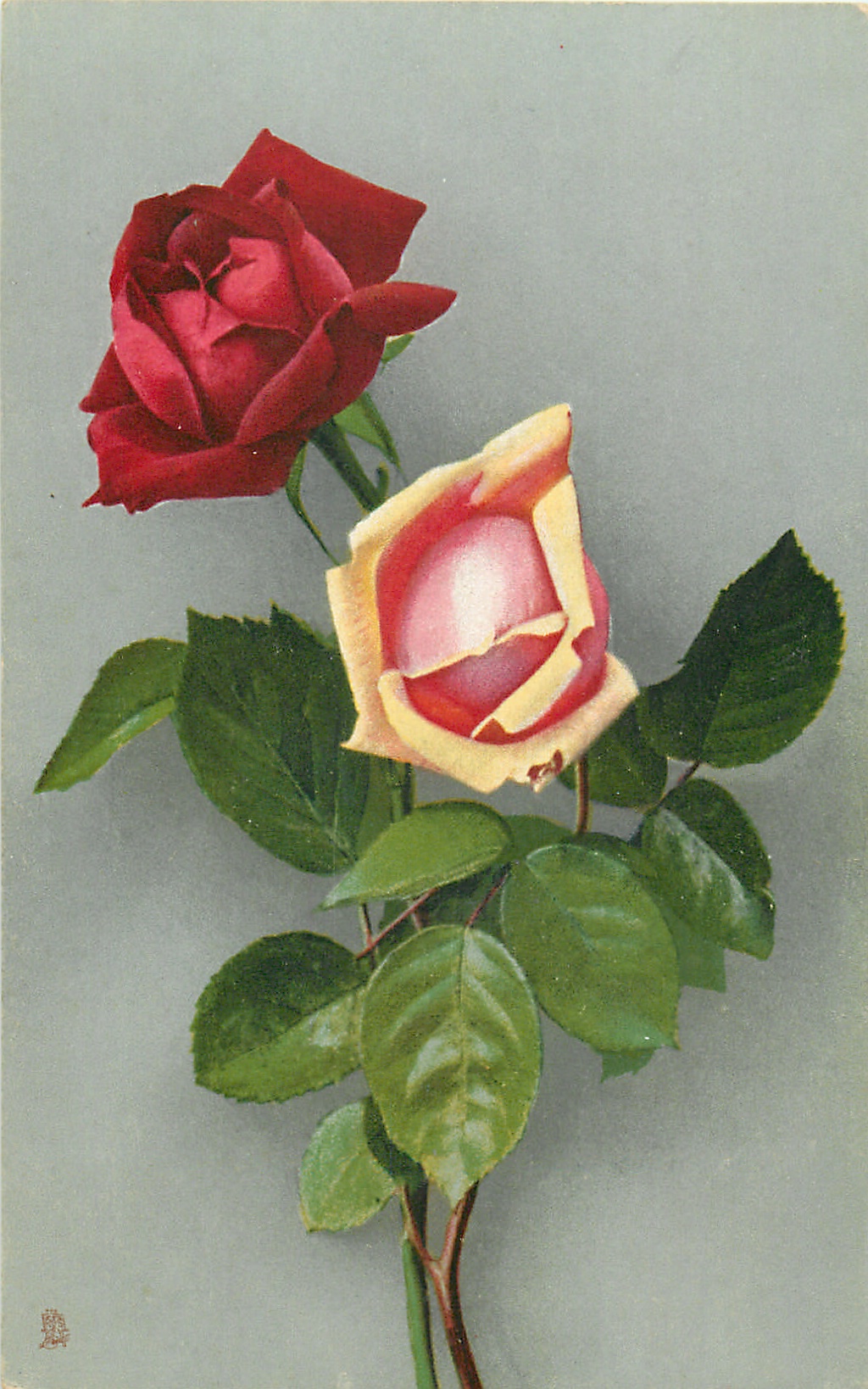 one red, one yellow/pink roses, stems to lower centre