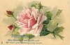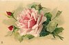 one pink rose, faces up to left, two buds to left, another faces up,stalks right