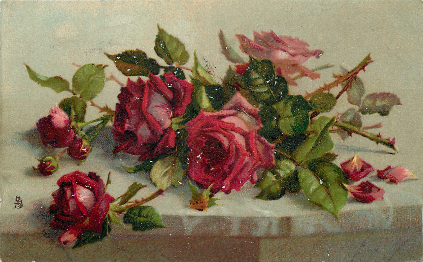 red roses on light green marble table, roses facing mostly left