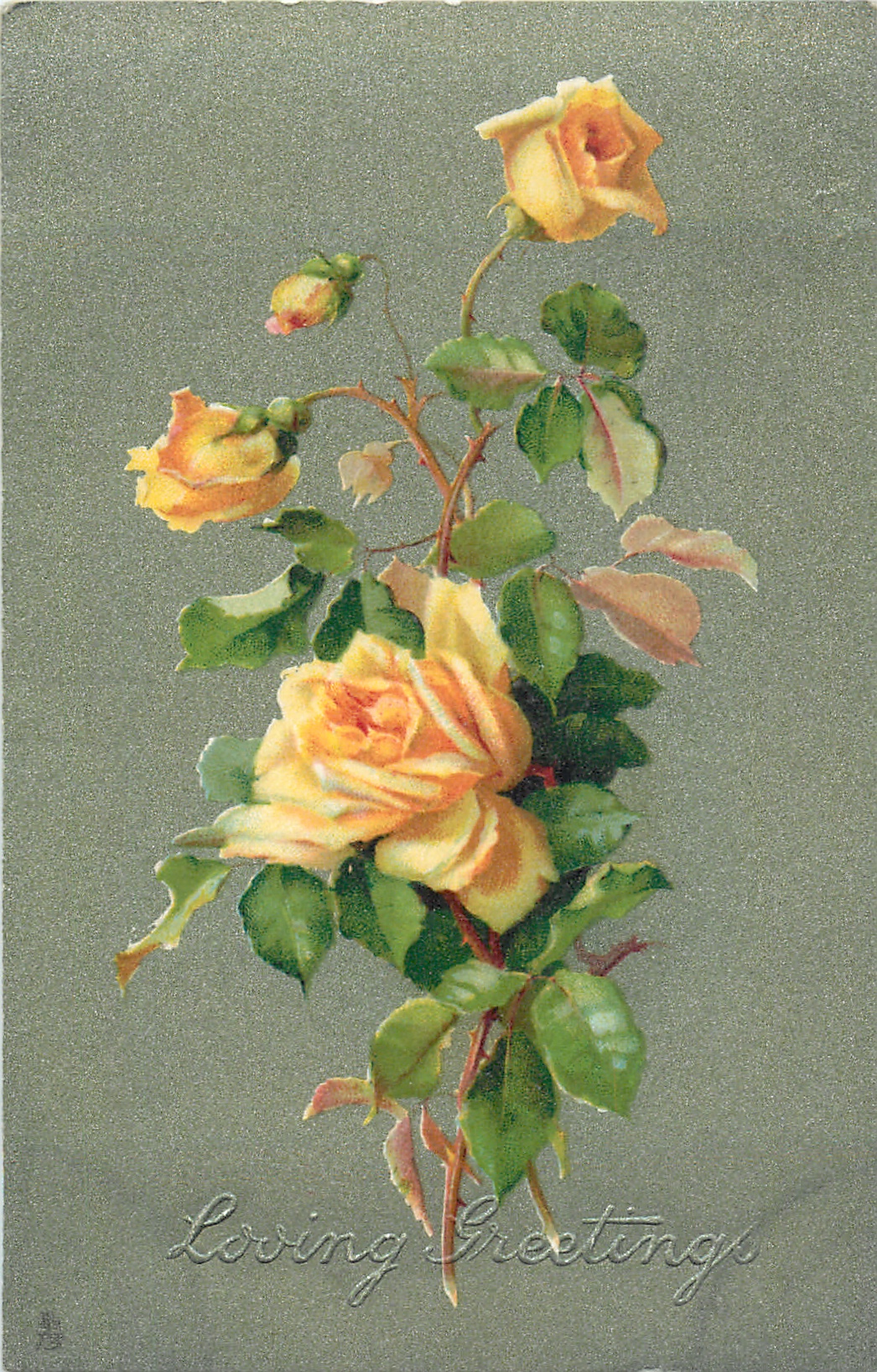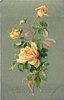 three yellow roses open, one bud showing color, two stems to bottom with green/silver background