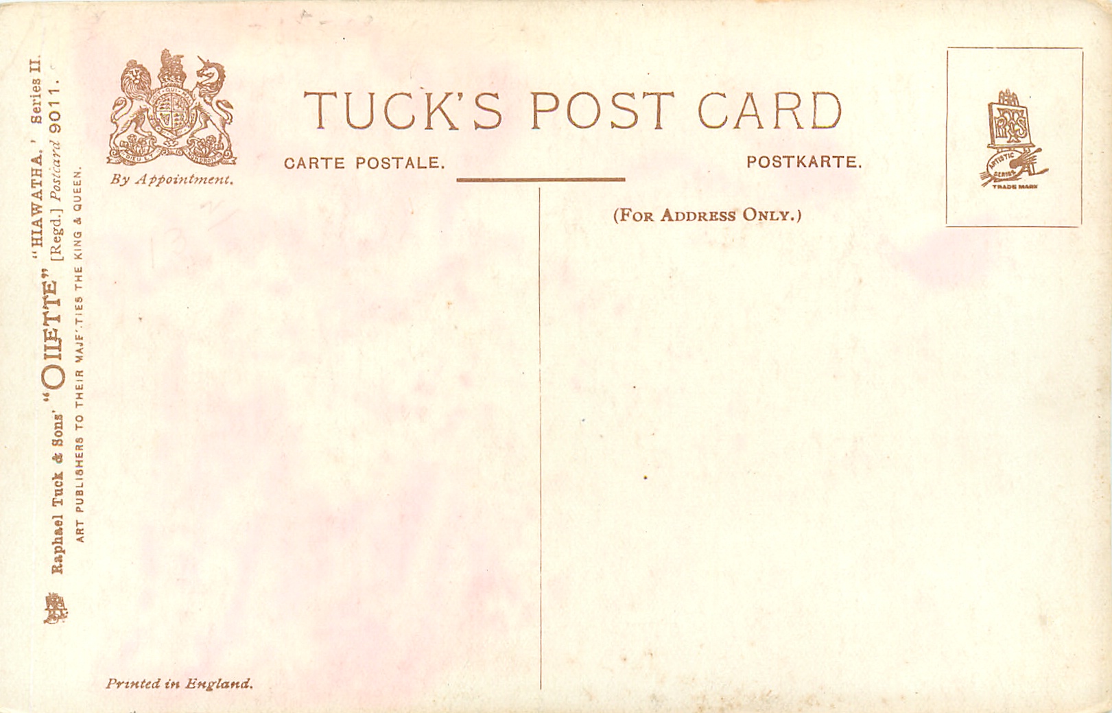 OILETTE, listed in 1911/1912 Catalogue, PRINTED IN ENGLAND, 3 backs, quotes THE SONG OF HIAWATHA - LONGFELLOW, listed in TUCK'S TRAVELOGUES (USA?1905)