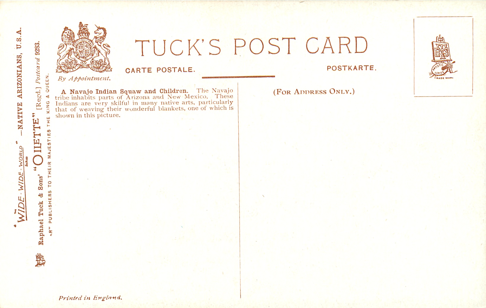 OILETTE, WIDE-WIDE-WORLD, PRINTED IN ENGLAND, listed as INDIAN BABIES & RED INDIAN BABIES in 1908/1909 & 1911/1912 & 1913/1914 & 1930 POSTCARD Catalogues, same images OILETTE 2431