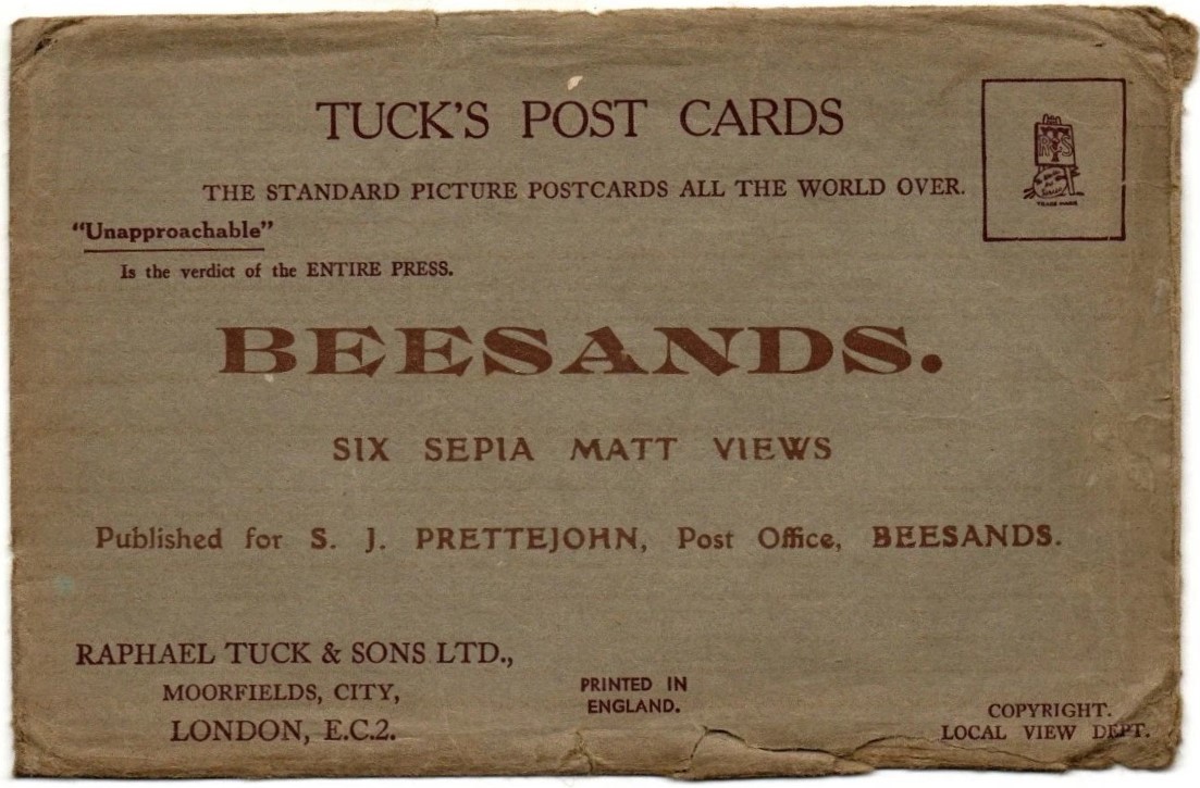 sepia, PRINTED IN ENGLAND, PUBLISHED FOR S. J. PRETTEJOHN, POST OFFICE, BEESANDS on set cover. Tuck confusion over card numbering - possibly 2 different sets of sepia cards?
