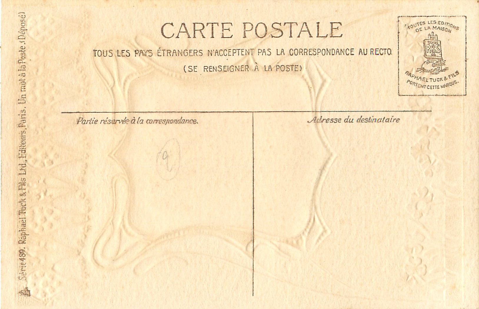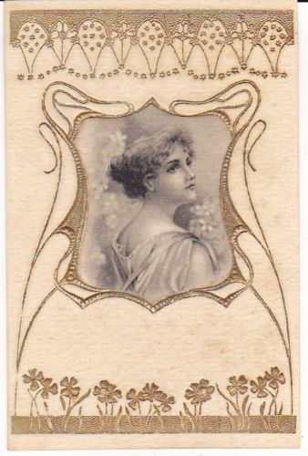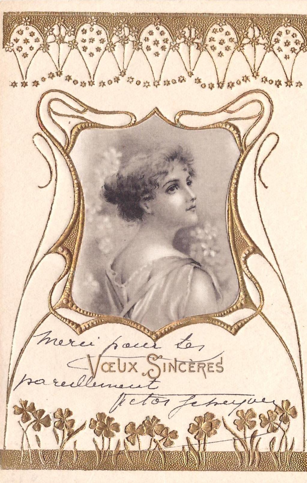 gilt embossed elaborate nouveau gilt decoration around irregular silk insets, UN MOT A LA POSTE, (DEPOSE)