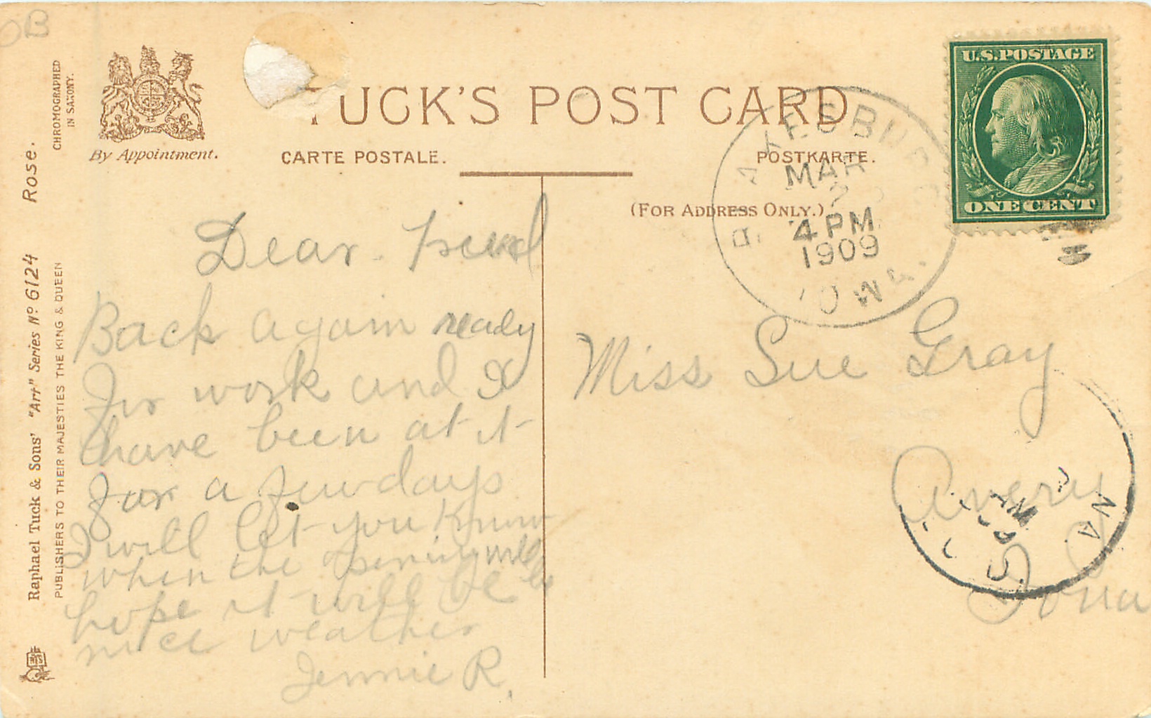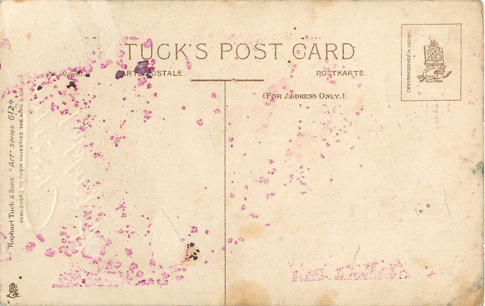 ART, CHROMOGRAPHED IN SAXONY (in or out of stamp box), deep green background, listed in 1911/1912 Postcard Catalogue