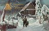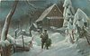 night snow scene, man carries Xmas tree towards house in woods with light in upper window