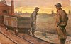 DAS BERGWERK 5.BILD two men stand looking away, rail car left