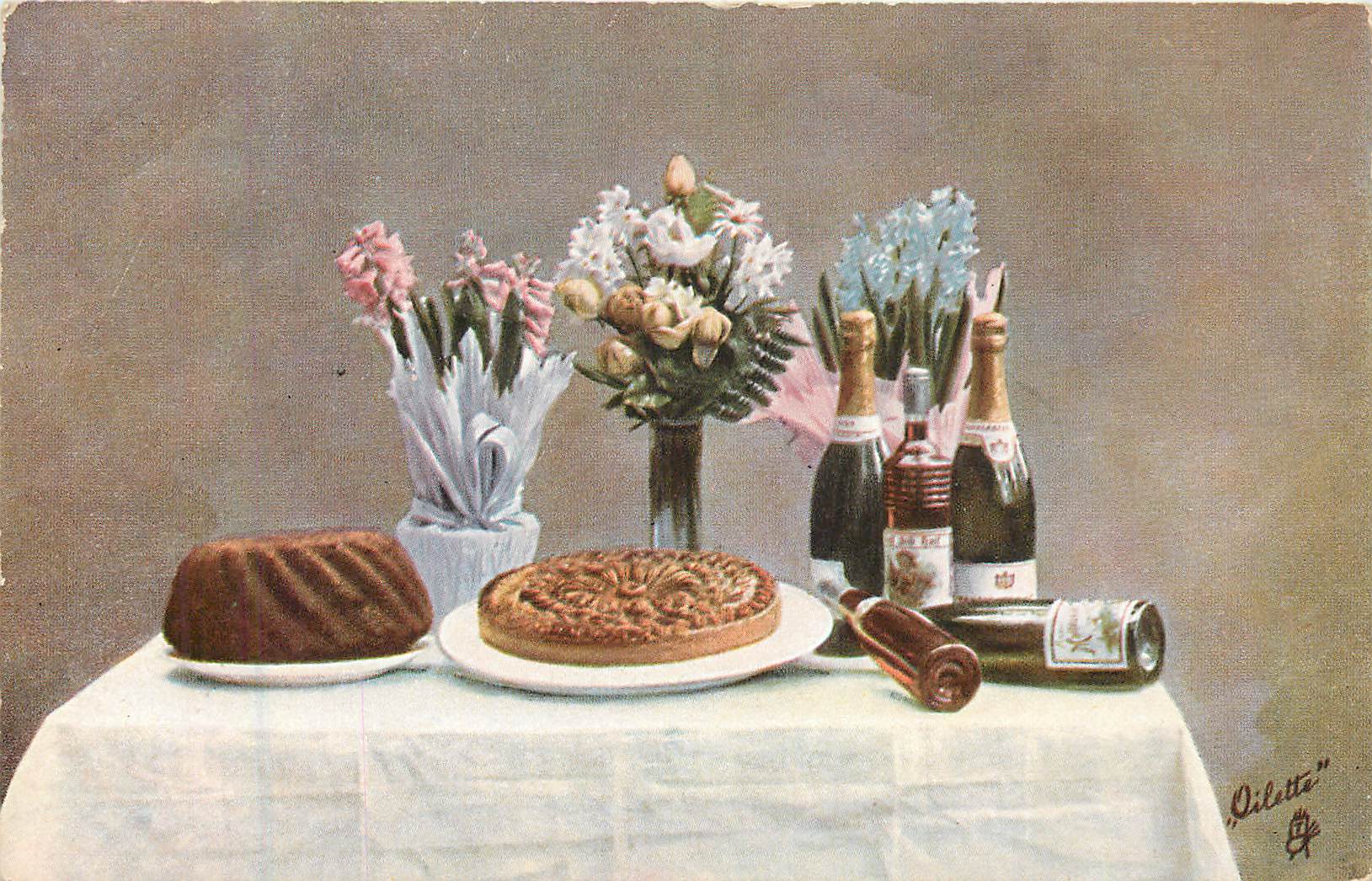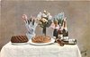 pots of blue & pink hyacinths on either side of vase of white flowers, 2 uncut cakes, wine bottles right on table