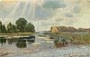 sushine over river, boat with yellow sail back, trees back left
