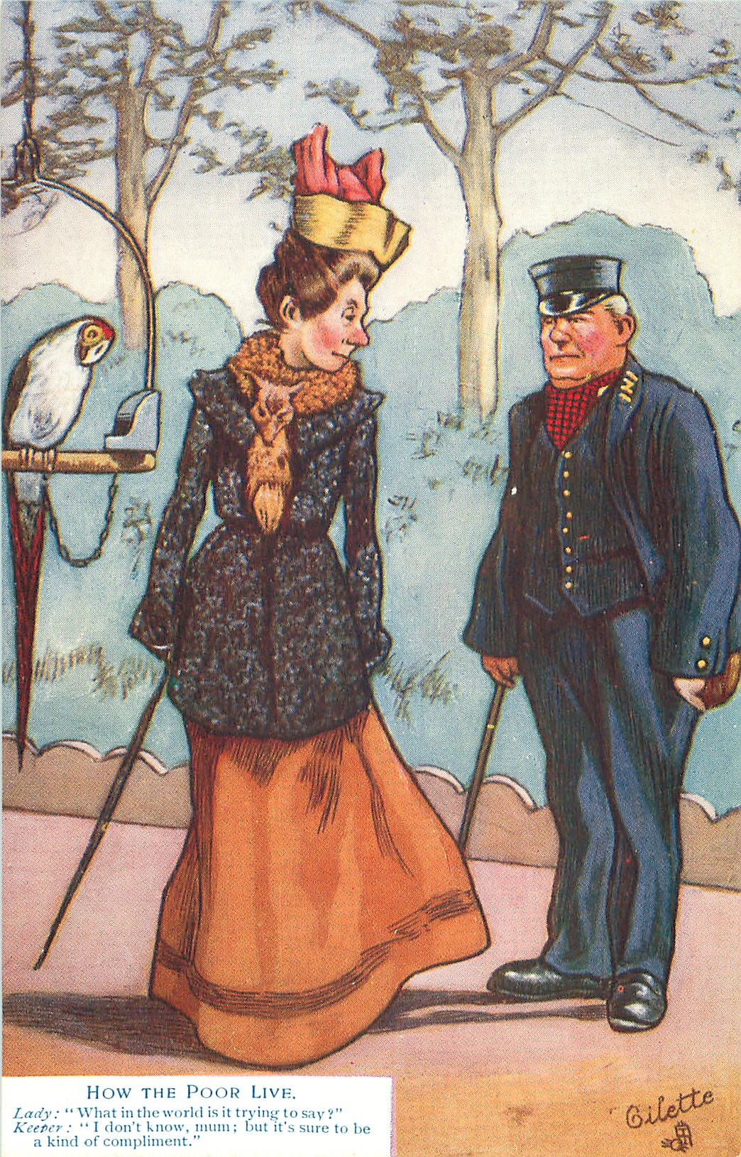 HOW THE POOR LIVE. LADY: "WHAT IN THE WORLD IS IT TRYING TO SAY?", KEEPER: "I DON'T KNOW, MUM; BUT IT'S SURE TO BE A KIND OF COMPLIMENT."