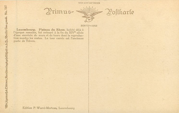 PRIMUS back & OILETTE on front, WOHLGEMUTH & LISSNER, KUNFTVERLAGSGRFELLFCCAFT, M.B.S. BERLIN GES.GESCH., EDITION P. WORRE-MERTENS, LUXEMBOURG,