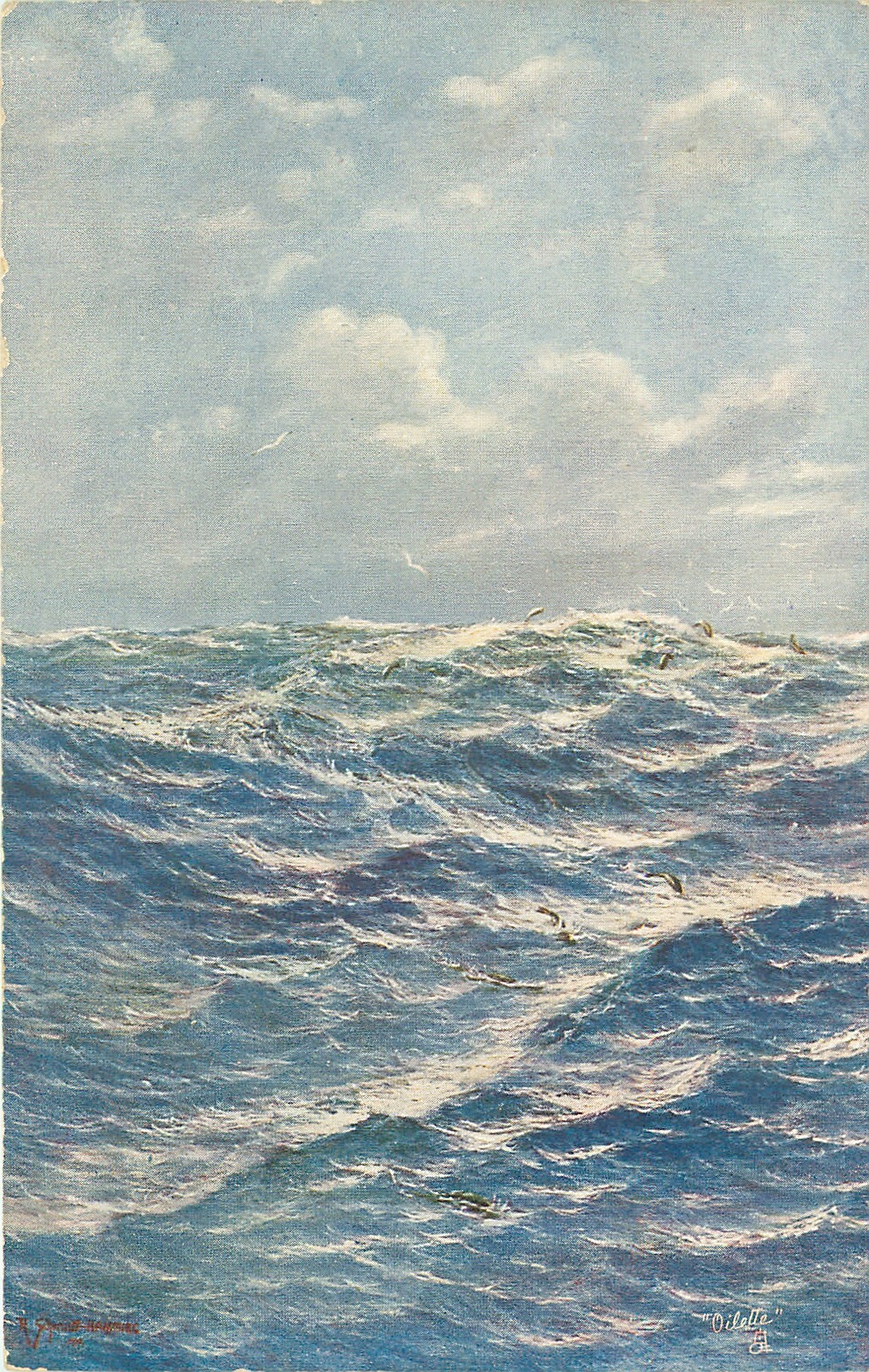 OILETTE, same images, English back, OILETTE CONNOISSEUR 2897 untitled cards WHAT ARE THE WILD WAVES SAYING?, SERIES X, NACH EINEM ORIGINAL VON ROBERT-SCHMIDT.