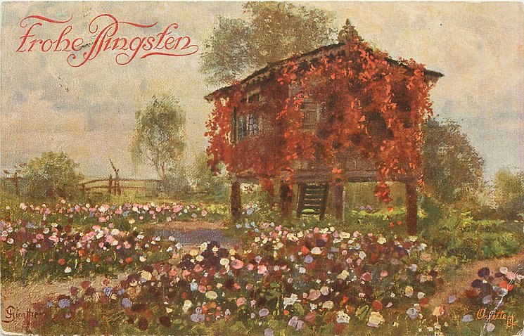 house covered with red creeper standing on stilts in field of many coloured flowers