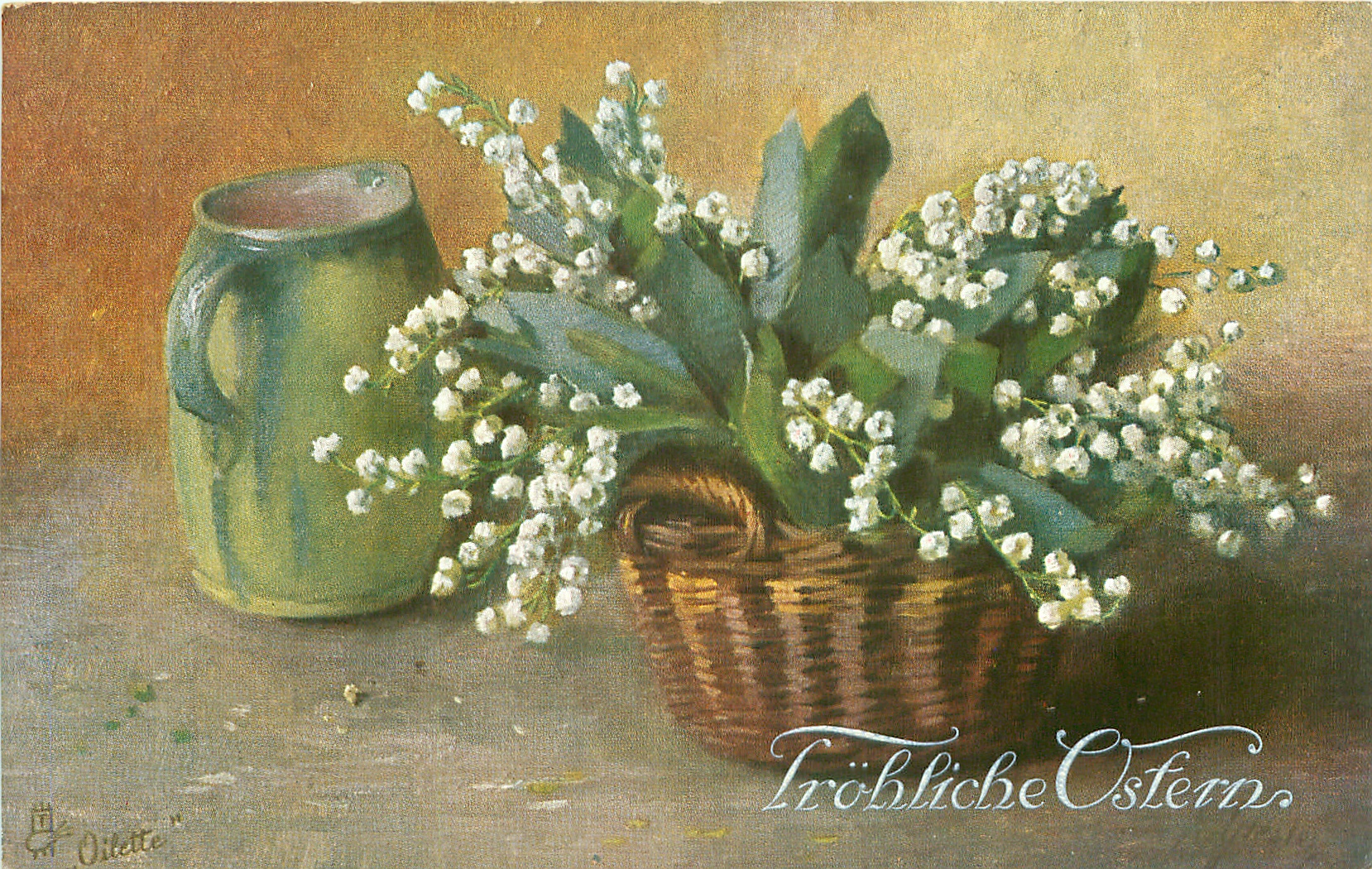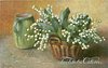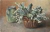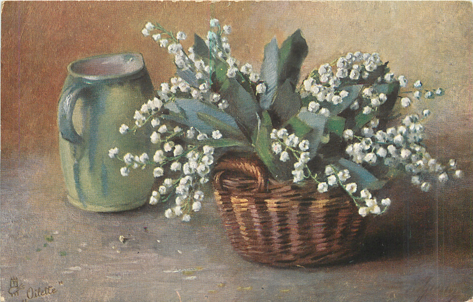 wicker basket, handle at side, full of lily-of-the-valley, green jug beside left