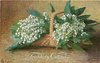 oblong wicker basket, handle at top, full of lily-of-the-valley