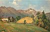 houses left, prominent central yellow field, mountains back