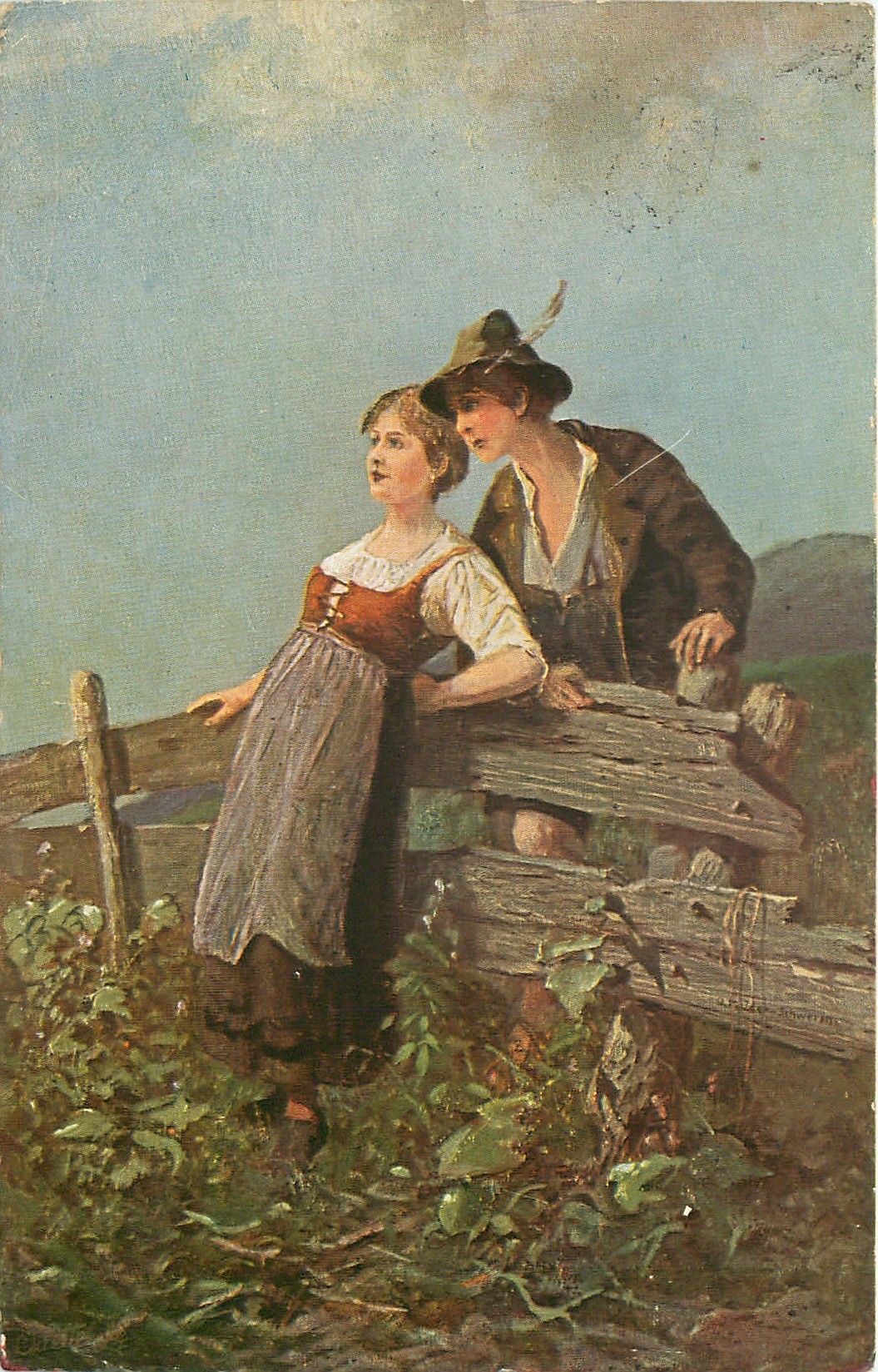 girl leans back on fence, her brother leans foward over it, both look intently left