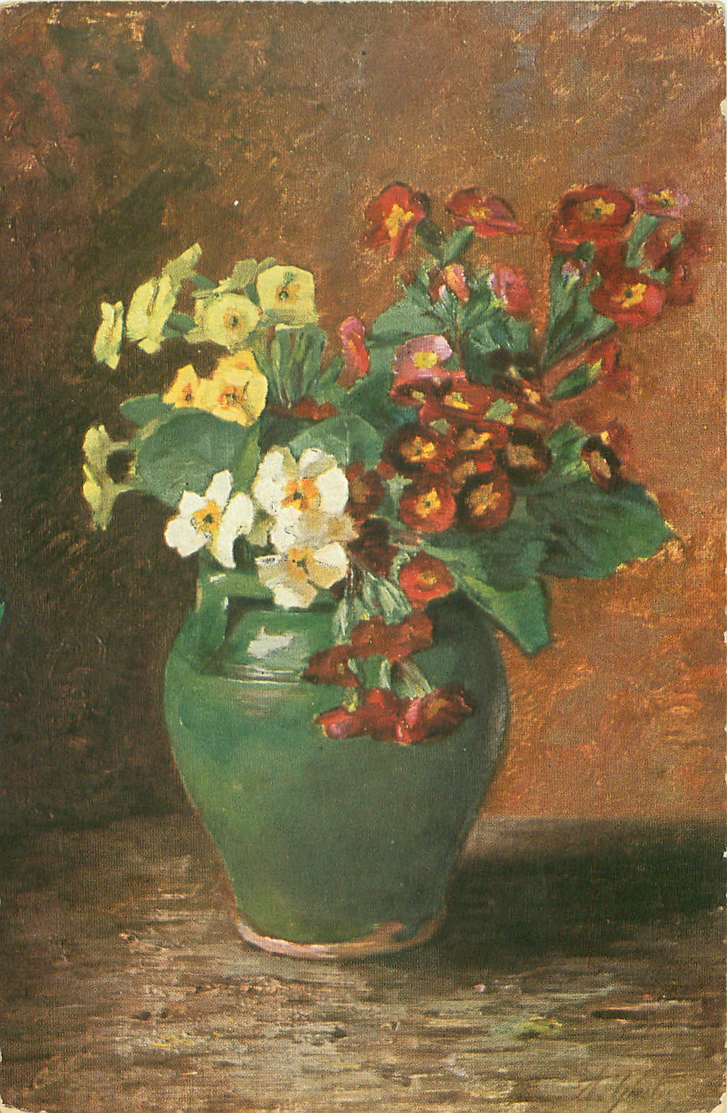 red, white & yellow polyanthus in green vase