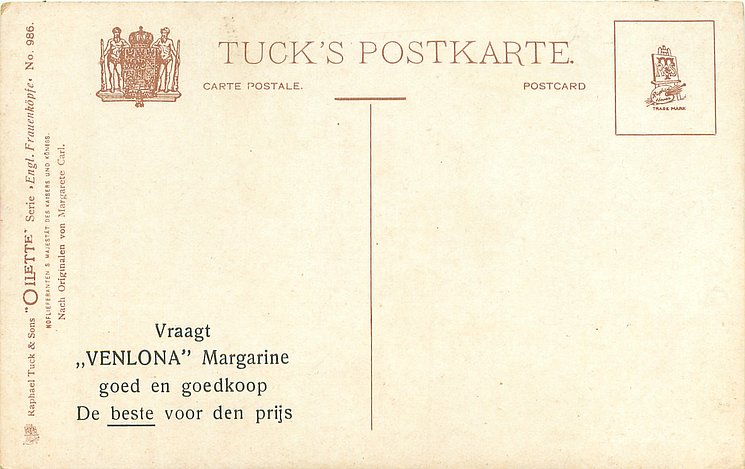 OILETTE, NACH ORIGINALEN VON MARGARETE CARL, come with & w/o card titles, come with CAFE LE LYS ROUGE BRUXELLOISE or VRAAGT "VELONA" MARGARINE GOED EN GOEDKOOP DE BESTE VOOR DEN PRIJS adverts in black on back