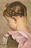 head & shoulder study of child in pink smock,facing back left, looking down left